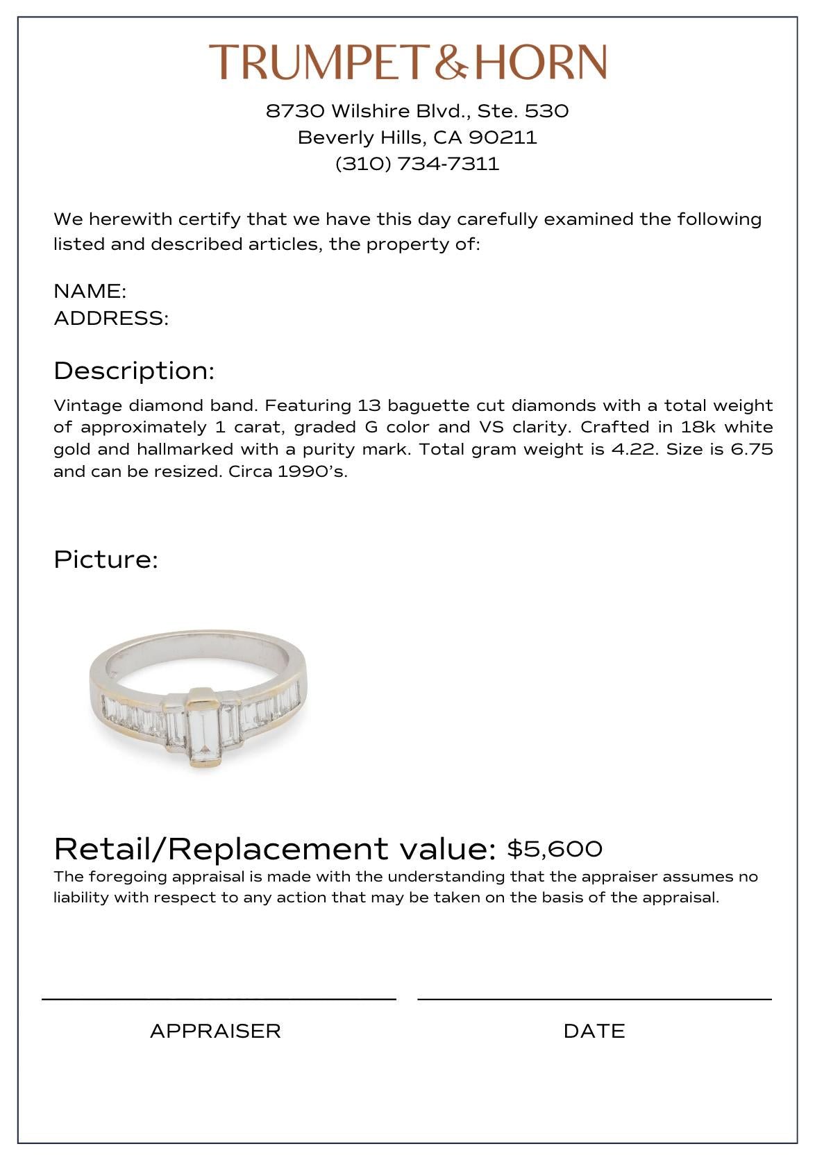 Vintage 18k white gold band with 13 baguette cut diamonds totaling 1 carat.