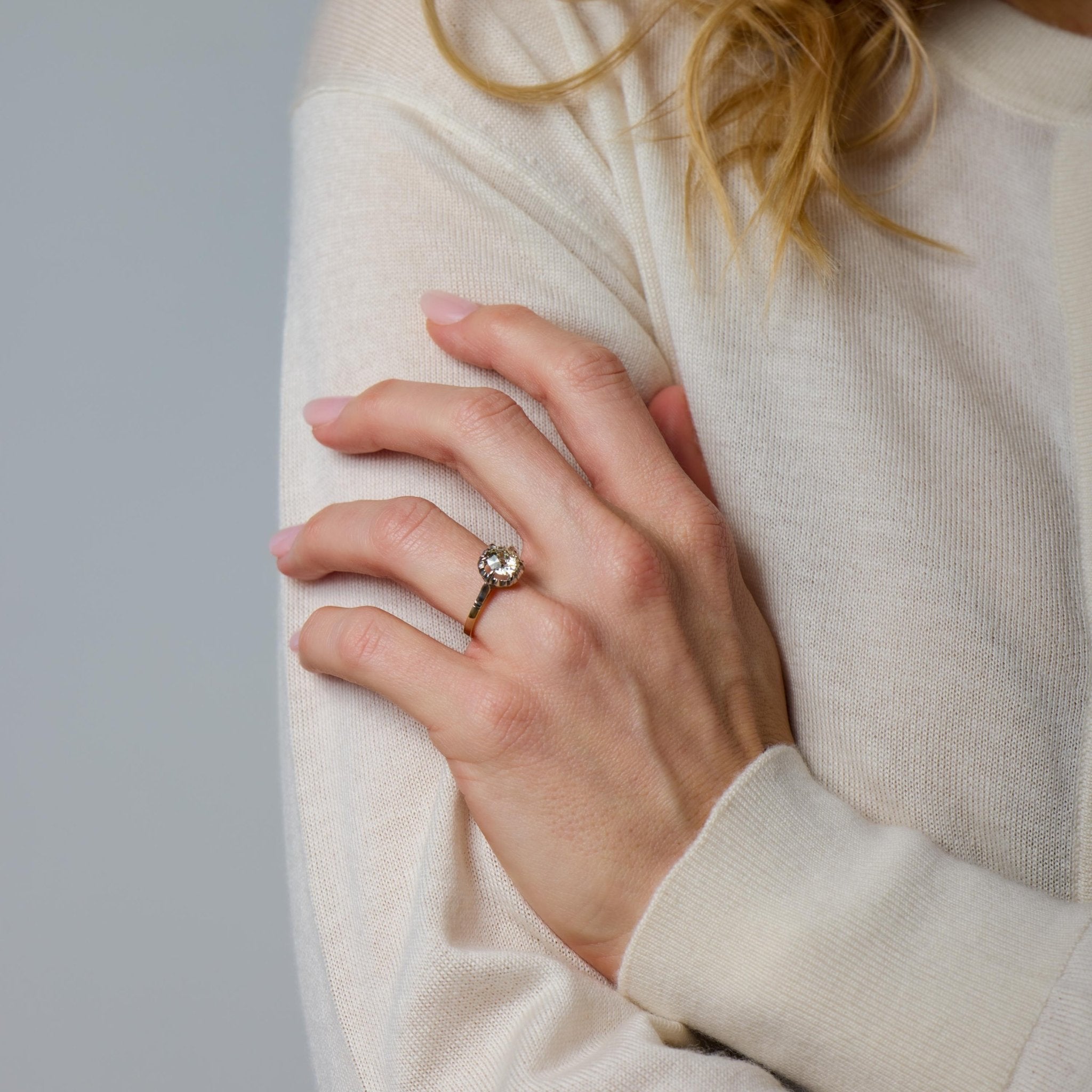 Set simply in 18k white gold, the solitaire design allows the diamond to take center stage without distraction. The clean lines and understated proportions reflect the Art Deco era’s appreciation for balance, geometry, and refined restraint. The white gold setting offers a cool, luminous contrast that highlights the diamond’s glow while maintaining a timeless, wearable aesthetic.