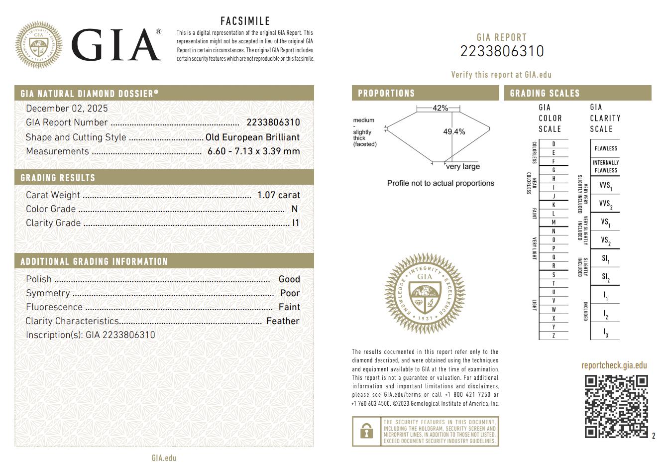 This authentic Art Deco solitaire ring is a refined and timeless expression of early 20th-century elegance, showcasing the beauty of a classic old European cut diamond in its purest form. The center diamond weighs 1.07 carats and displays the distinctive faceting that defines old European cuts—broad, hand-cut facets that produce a soft, romantic glow rather than modern brilliance. Its N color lends a gentle warmth that enhances the stone’s antique character, while the diamond’s presence remains striking and full of life.