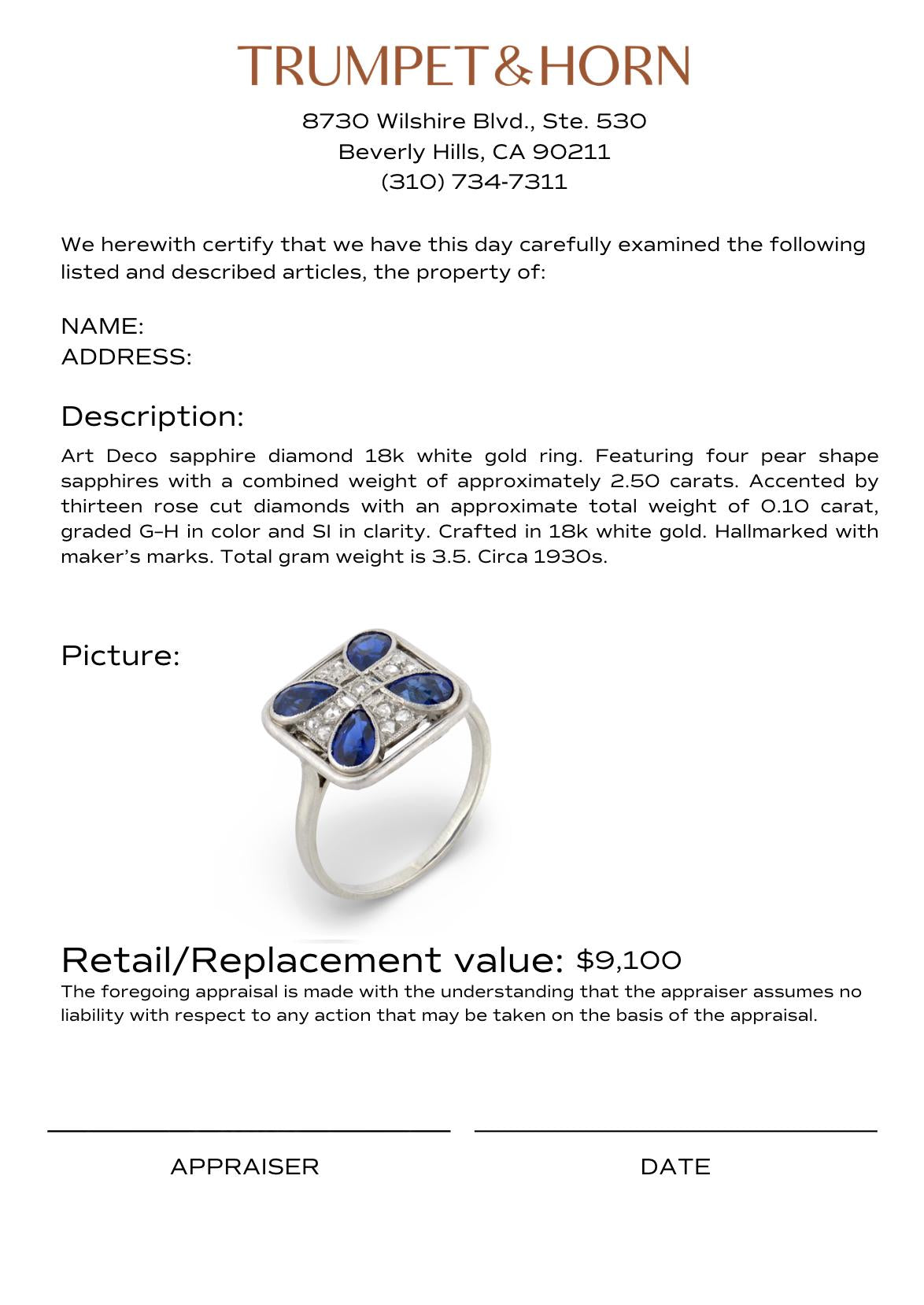 A bold Art Deco ring showcasing pear shape sapphires and rose cut diamonds in luminous 18k white gold.