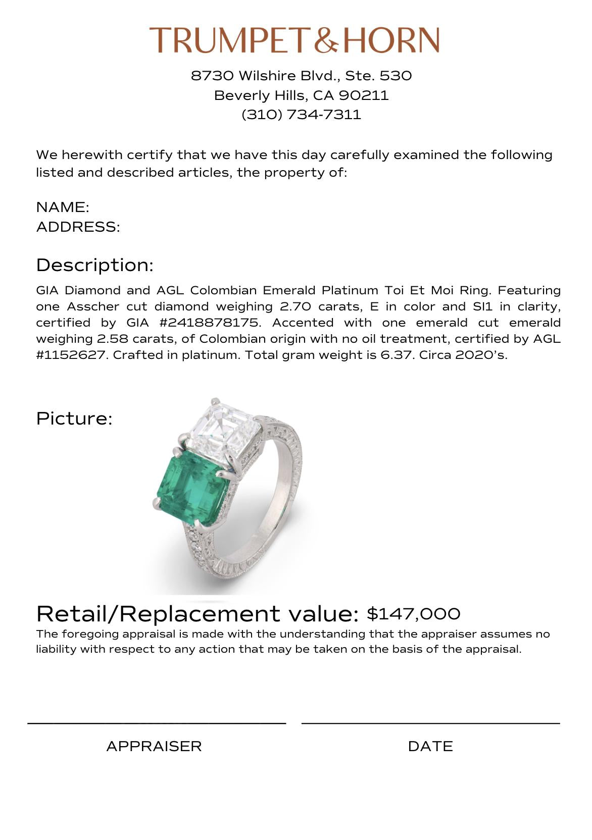 GIA 2.70 ct diamond AGL 2.58 ct Colombia No Oil emerald platinum Toi Et Moi ring