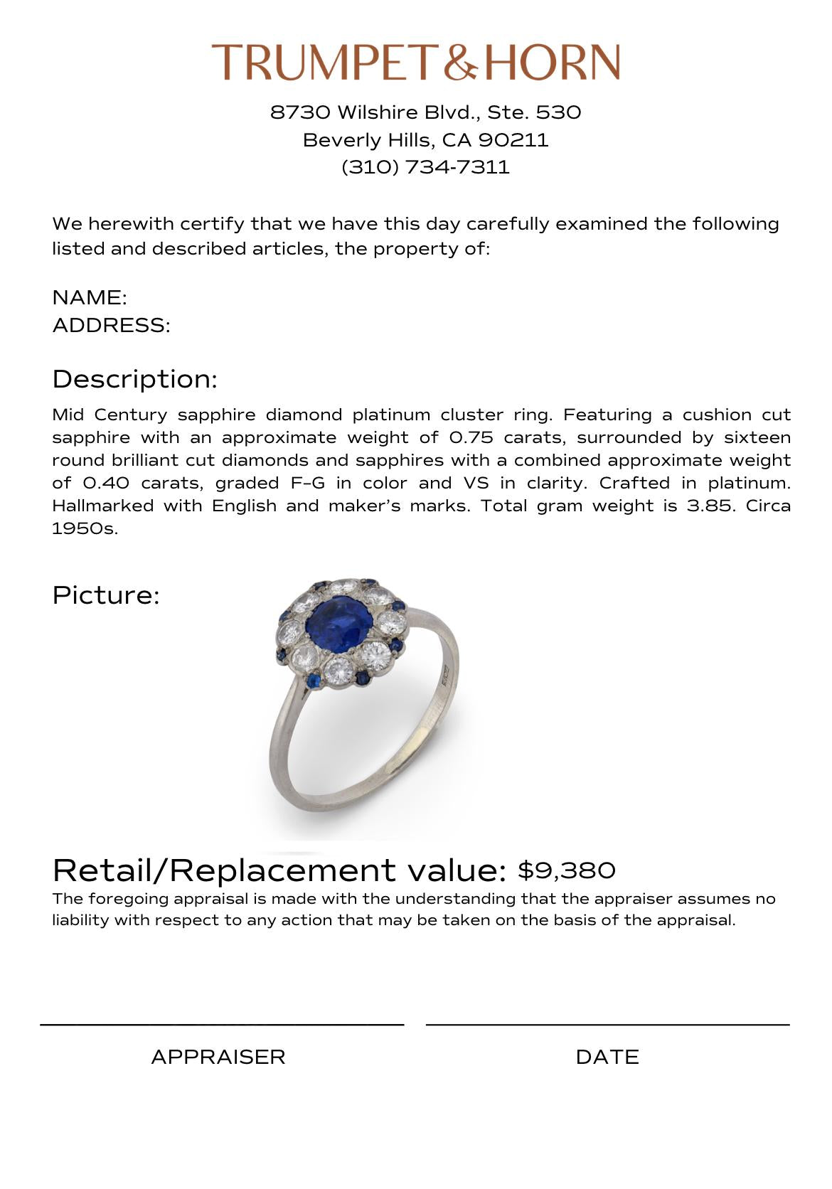 This refined Mid Century cluster ring captures the balanced elegance and confident design language of the 1950s. At its center rests a cushion cut sapphire, softly contoured and rich in presence, anchoring the composition with understated color and depth. Encircling the center stone, a harmonious arrangement of round brilliant cut diamonds and sapphires creates a luminous halo that enhances both brilliance and contrast.