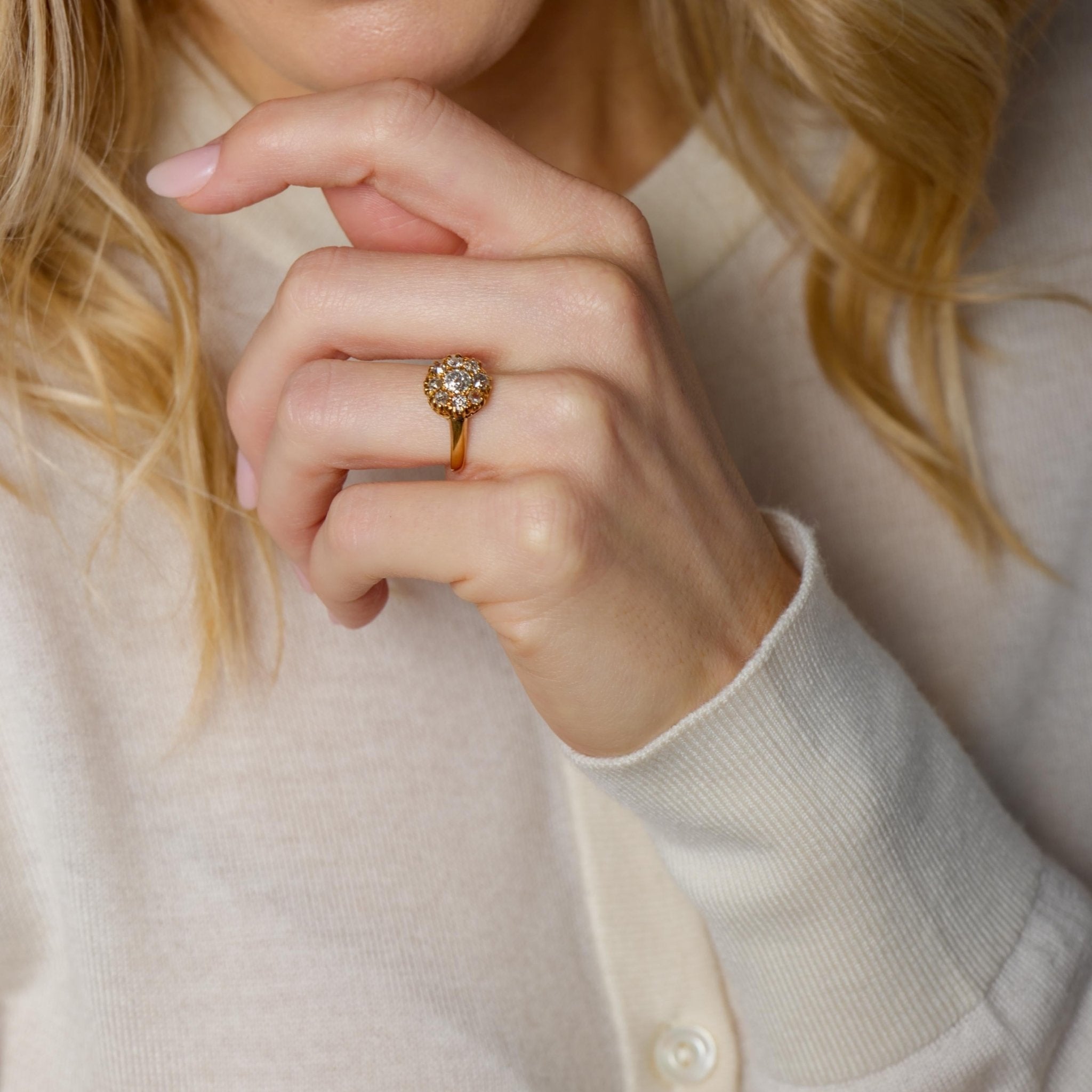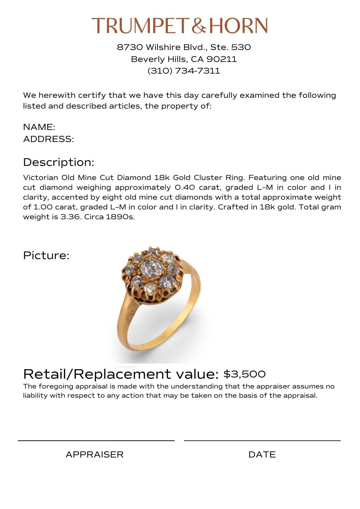 Set in warm 18k gold, the cluster design enhances the ring’s antique character while providing a balanced, elegant profile. The gold setting frames the diamonds beautifully, reinforcing the romantic aesthetic that defined Victorian jewelry.