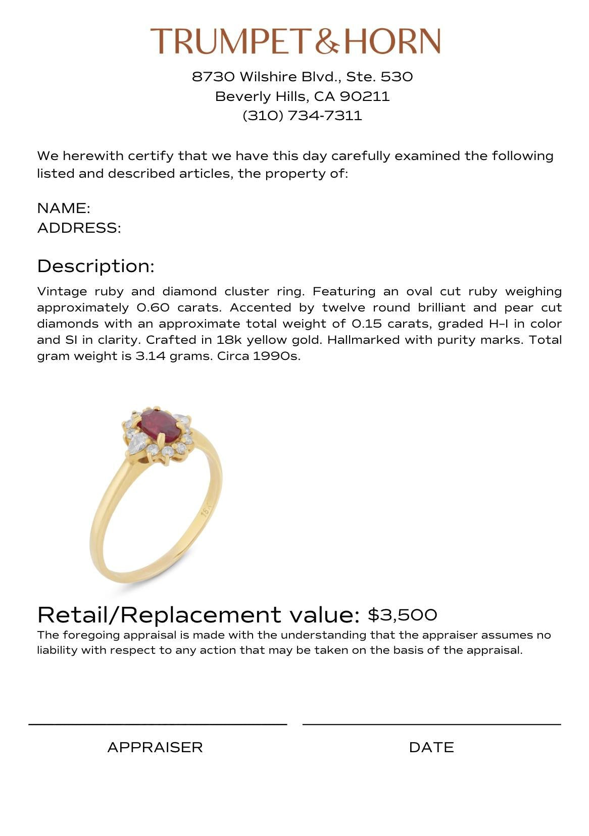 This vintage ruby and diamond cluster ring is a refined expression of warmth, color, and timeless design. At its center rests an oval cut ruby, its rich red hue creating a captivating focal point that feels both elegant and enduring. The ruby’s graceful shape draws the eye inward, offering a sense of depth and romantic presence.