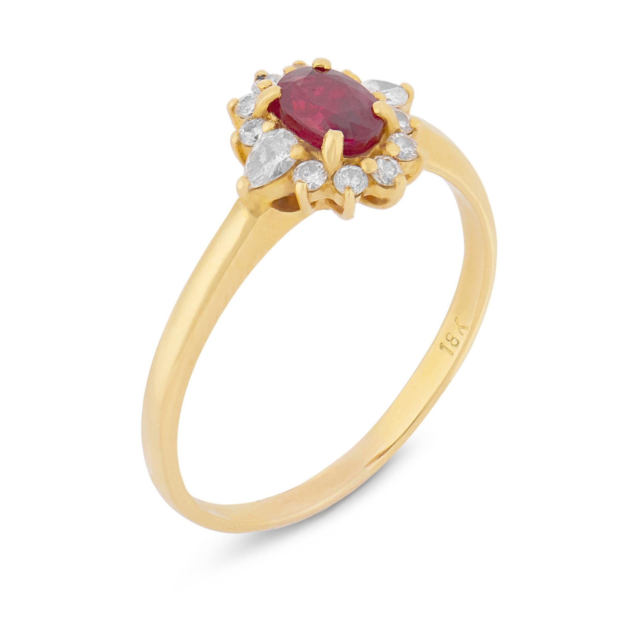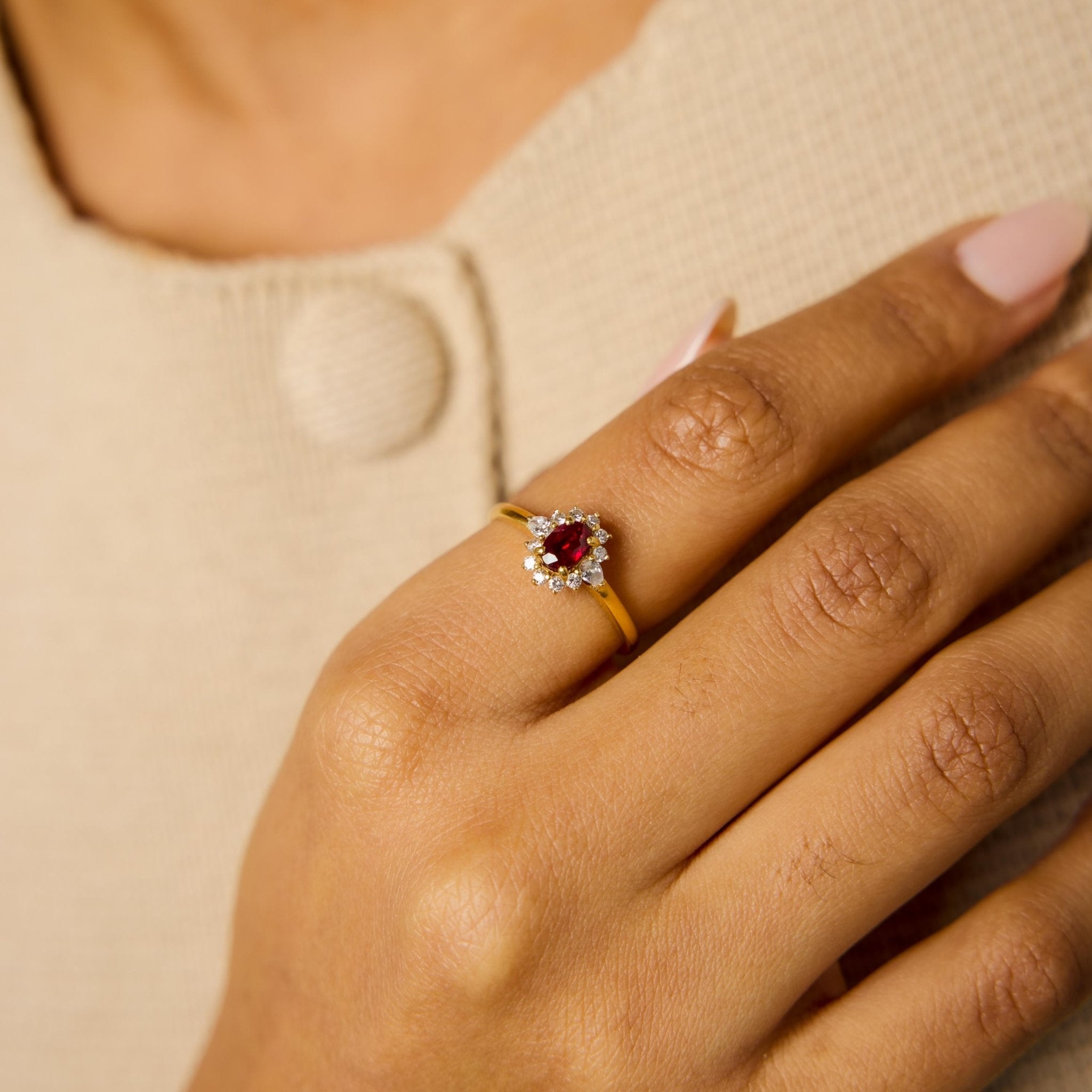 Surrounding the center stone, a thoughtful arrangement of round brilliant and pear cut diamonds adds soft brilliance and gentle movement. Their subtle sparkle enhances the ruby without overwhelming it, creating a harmonious balance between color and light. Crafted in luminous 18k yellow gold, the setting brings warmth and cohesion to the design, highlighting the gemstones with a classic glow.