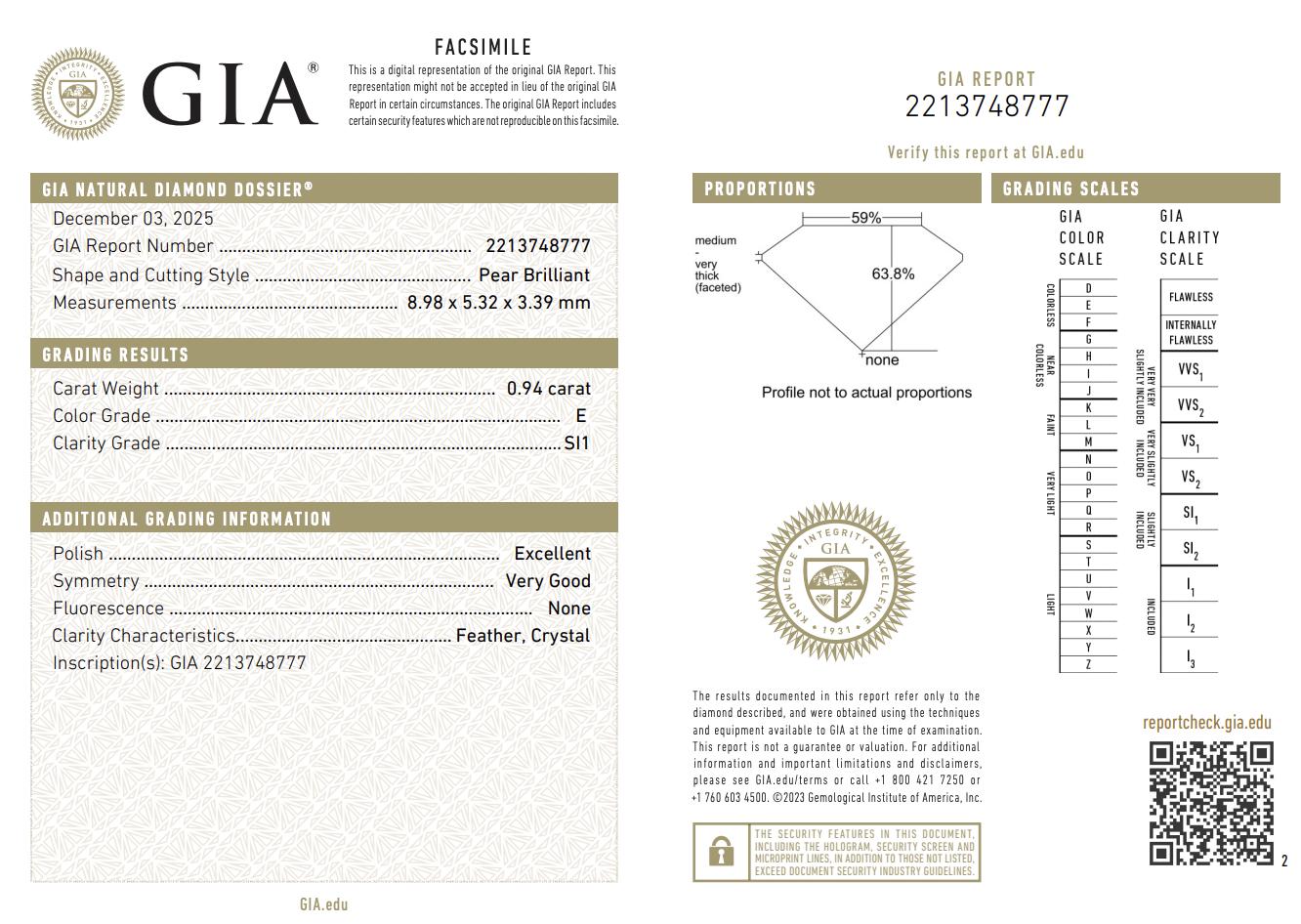 This refined engagement ring is a beautiful expression of balance, brilliance, and warmth, designed to highlight a perfectly proportioned pear shape diamond at its center. The GIA-certified 0.94-carat diamond displays exceptional brightness, with its E color offering crisp, luminous sparkle and its SI1 clarity maintaining a clean, lively appearance. The pear shape lends graceful movement and elongation, creating a romantic silhouette that feels both timeless and modern.