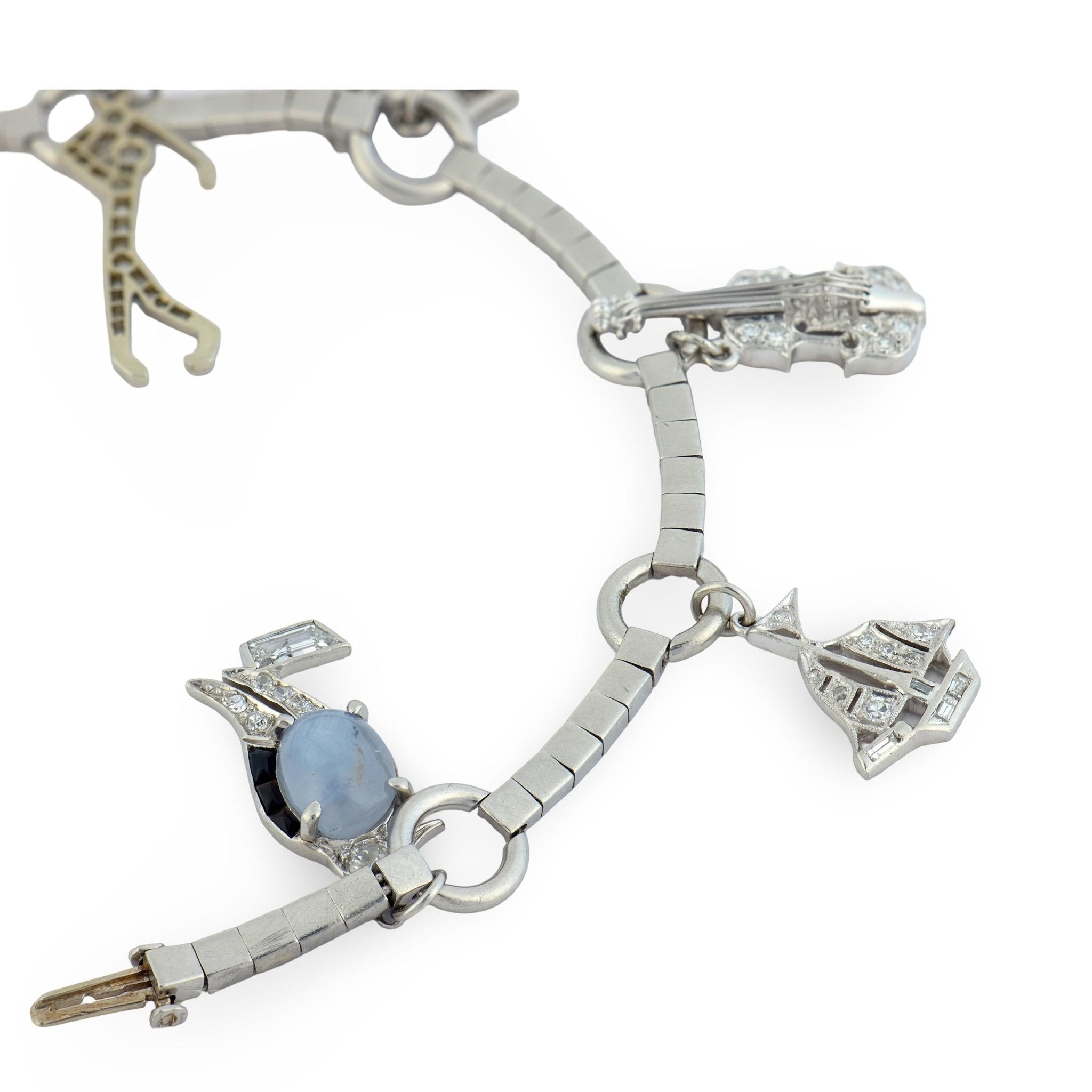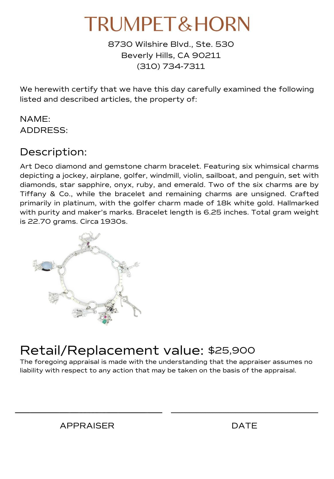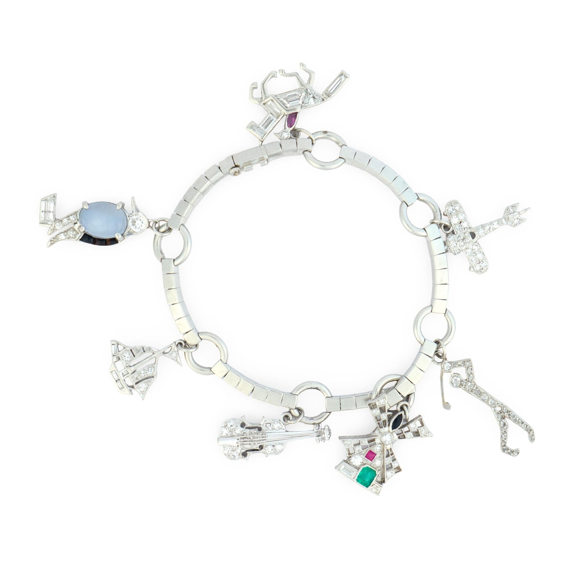 A playful Art Deco platinum charm bracelet featuring gemstone-set motifs, including signed Tiffany & Co. charms.