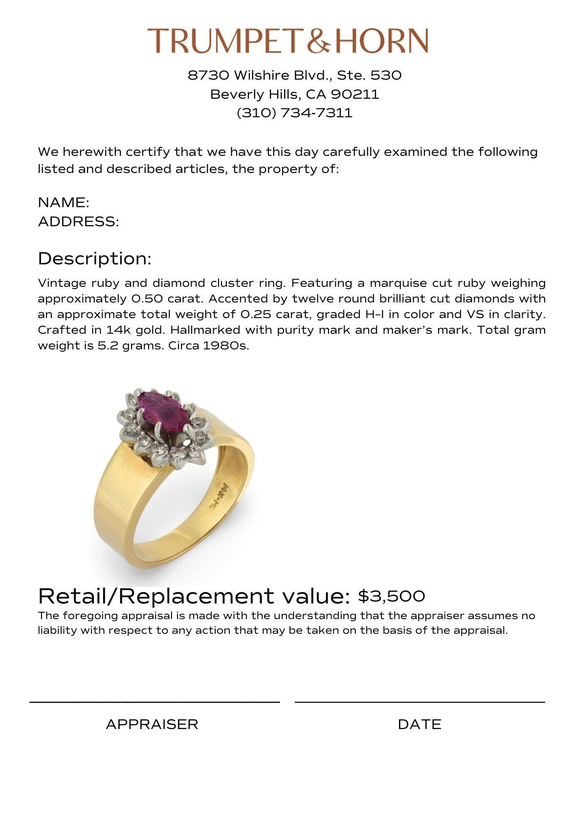 This vintage ruby and diamond cluster ring is a refined celebration of color, symmetry, and enduring design. At its center rests a marquise cut ruby, its elongated form lending elegance and presence while drawing the eye with rich, saturated color. The ruby’s graceful silhouette creates a striking focal point that feels both timeless and expressive.