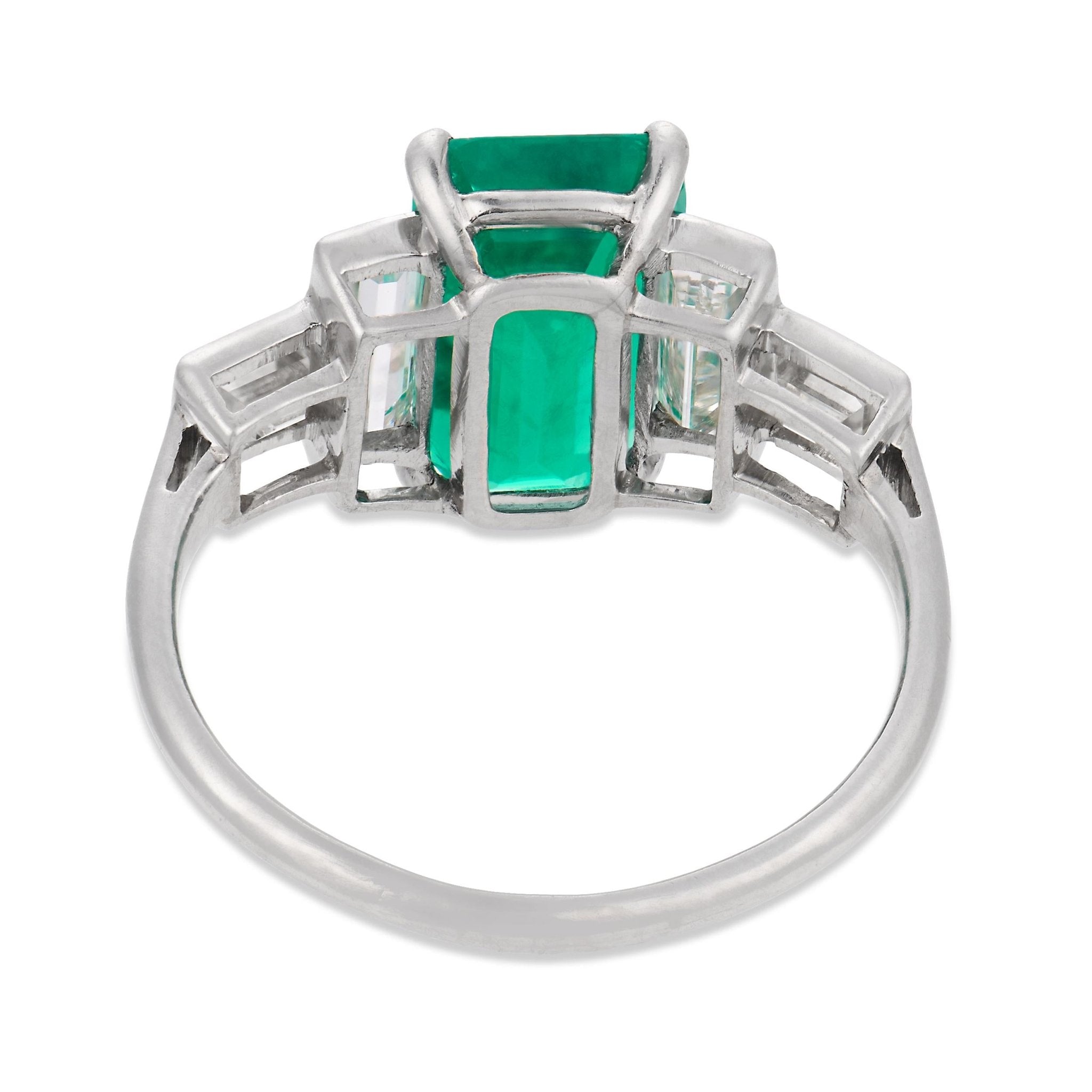 This striking Art Deco ring centers on a richly colored 2.65 carat emerald cut Colombian emerald, certified by AGL #1155448, displaying the coveted depth and vibrancy associated with its origin, enhanced only by minor traditional oil. Flanking the center stone are four sleek baguette cut diamonds totaling approximately 1.10 carats, graded G color and VS clarity, adding crisp brilliance and architectural balance to the design. Crafted in platinum during the 1930s, the ring embodies the bold geometry and refined elegance of the Art Deco era, with clean lines that highlight the natural beauty of each gemstone. Weighing 4.00 grams and currently a size 4.75, this piece is a timeless and sophisticated statement of vintage luxury.
