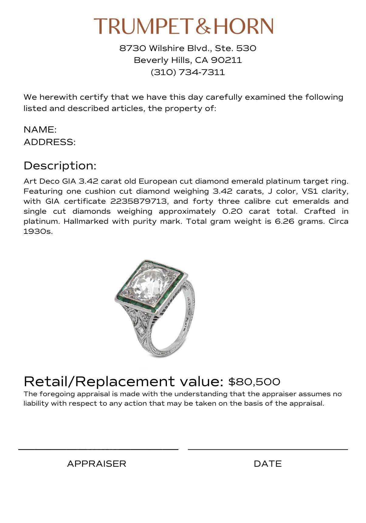 Art Deco GIA 3.42 carat old European cut diamond emerald platinum target ring