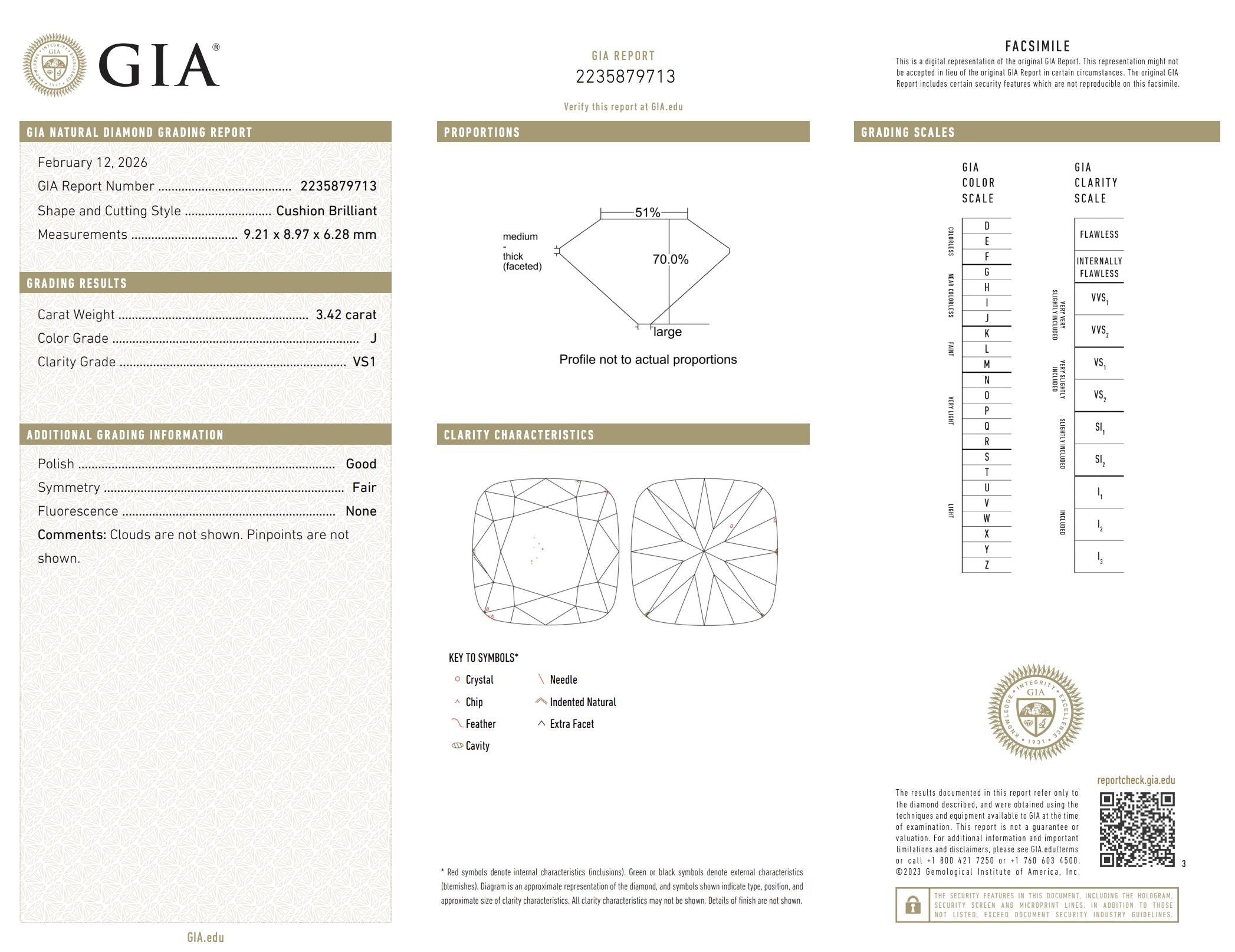 A breathtaking Art Deco target ring centered around an exceptional 3.42 carat diamond, radiating timeless elegance and bold geometric beauty. The cushion-shaped diamond displays a captivating brilliance, with broad facets that reflect light in a soft yet powerful glow, embodying the charm of antique cutting styles.