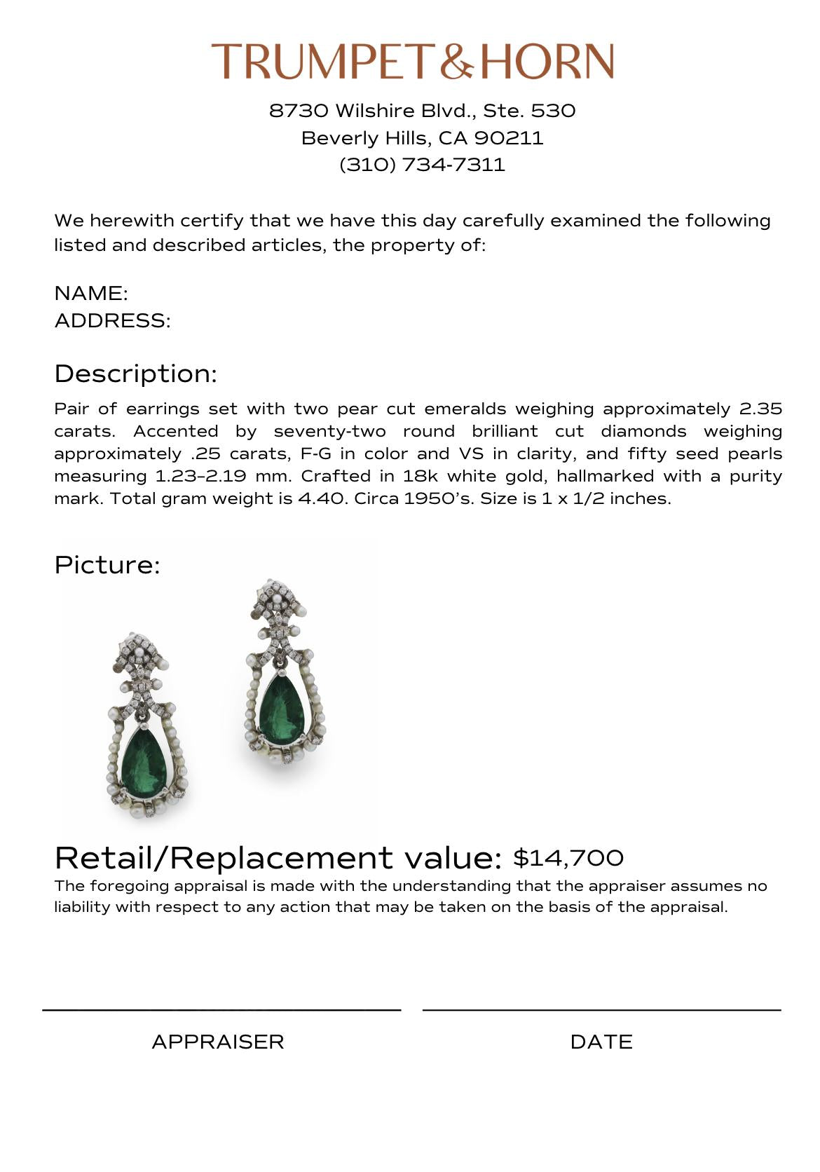 These Mid-Century earrings from the 1950’s are crafted in 18k white gold and set with two pear cut emeralds totaling approximately 2.35 carats. Surrounding the emeralds are seventy-two round brilliant cut diamonds totaling .25 carats, graded F-G color and VS clarity, along with fifty seed pearls measuring 1.23–2.19 mm. Hallmarked with a purity mark, this 4.40 gram pair measures 1 by 1/2 inches, combining lush green color, refined sparkle, and delicate luster in timeless vintage design.