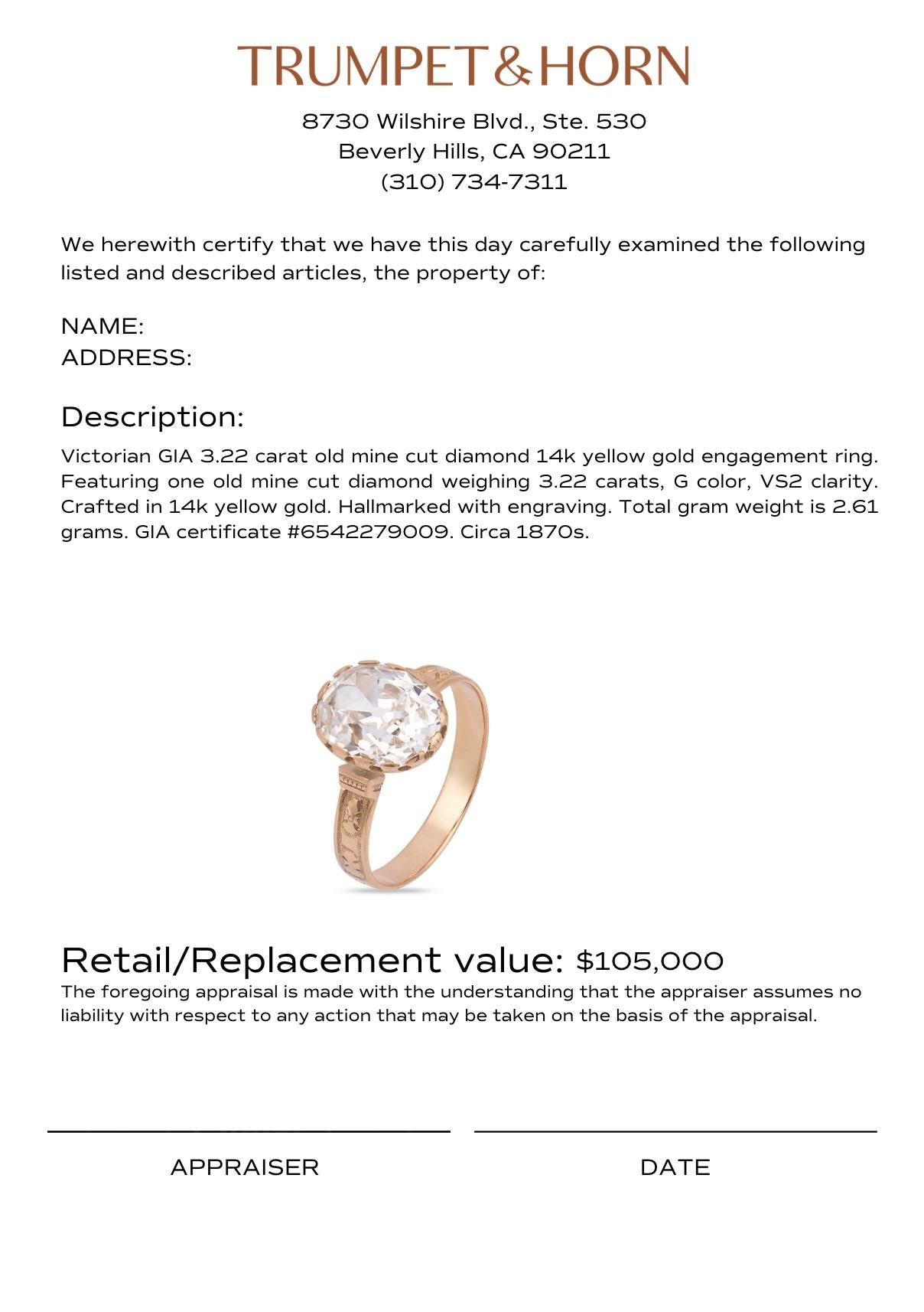 An extraordinary Victorian engagement ring featuring a GIA-certified 3.22 carat old mine cut diamond set in classic yellow gold.