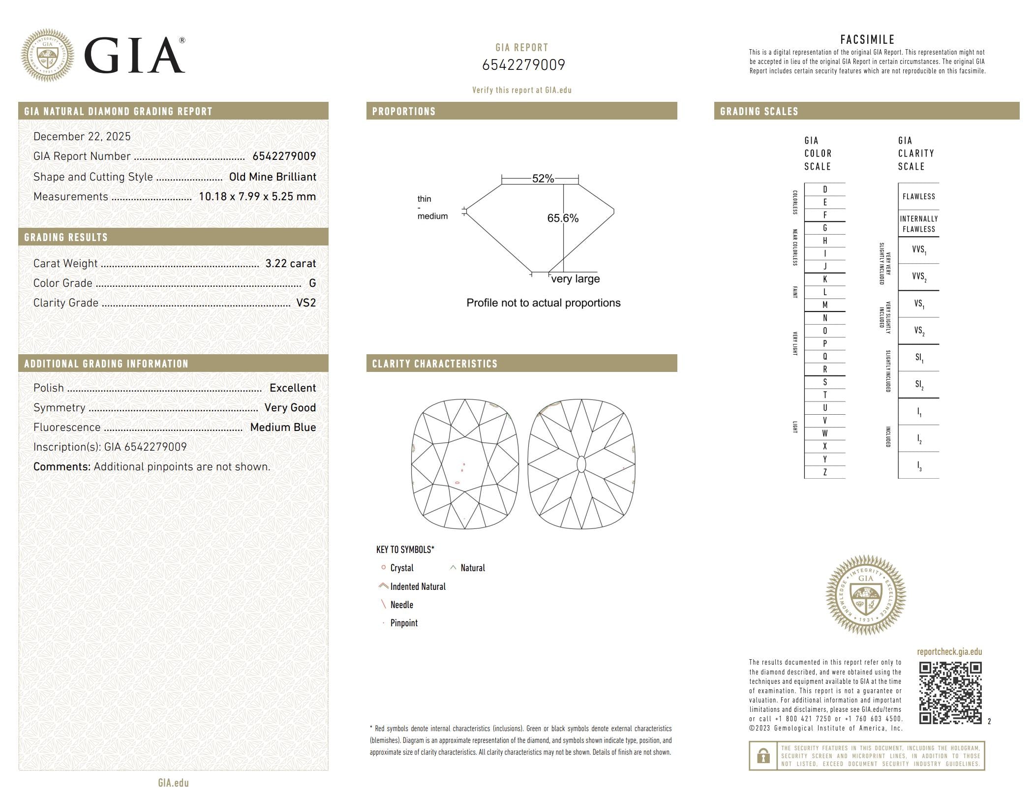 An exceptional and rare Victorian engagement ring centered around a remarkable GIA-certified old mine cut diamond weighing 3.22 carats. The antique diamond displays the distinctive charm of early cutting techniques, with its softly rounded outline, high crown, and open culet creating a warm, romantic glow unlike modern stones. Its impressive G color and VS2 clarity further enhance its brilliance and desirability.