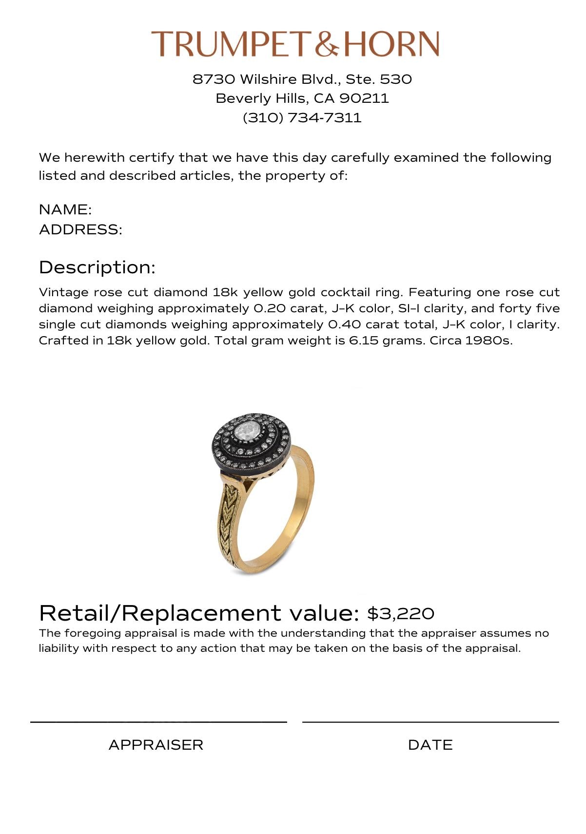 A bold and eye-catching vintage cocktail ring that beautifully combines antique-inspired charm with statement presence. At the center, a softly glowing rose cut diamond offers a subtle, romantic shimmer, its low profile and broad facets reflecting light in a uniquely gentle way.