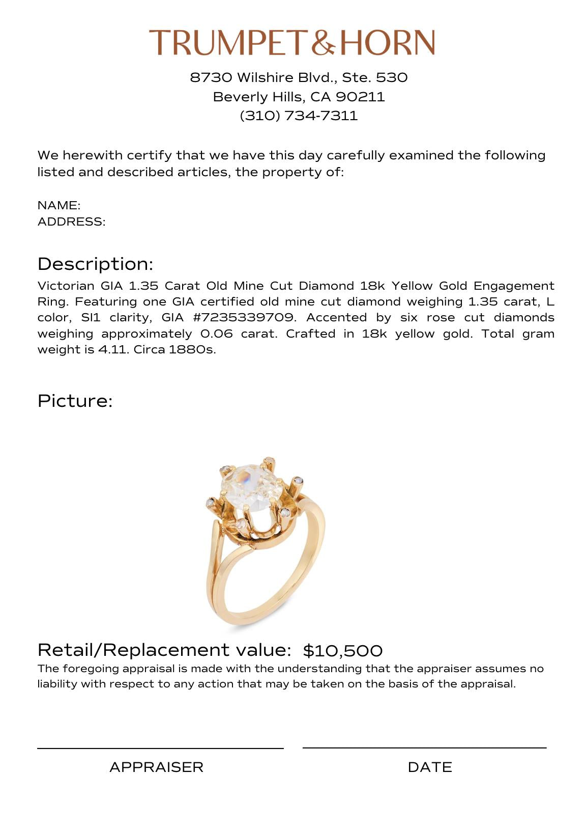 Victorian GIA 1.35 carat old mine cut diamond 18k yellow gold engagement ring