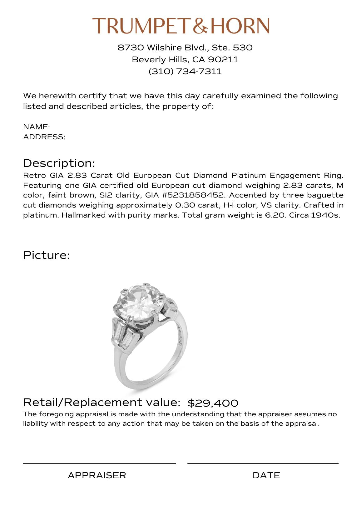This striking Retro engagement ring showcases a beautifully bold 2.83 carat old European cut diamond, glowing with soft, romantic brilliance and distinctive antique character. The center stone’s warm tone adds depth and individuality, enhanced by its broad facets and captivating light return. Flanked by sleek baguette cut diamonds, the design introduces a refined geometric contrast that reflects the confident styling of the 1940s. Set in polished platinum, the ring offers a strong yet elegant presence, making it a timeless statement of vintage sophistication.