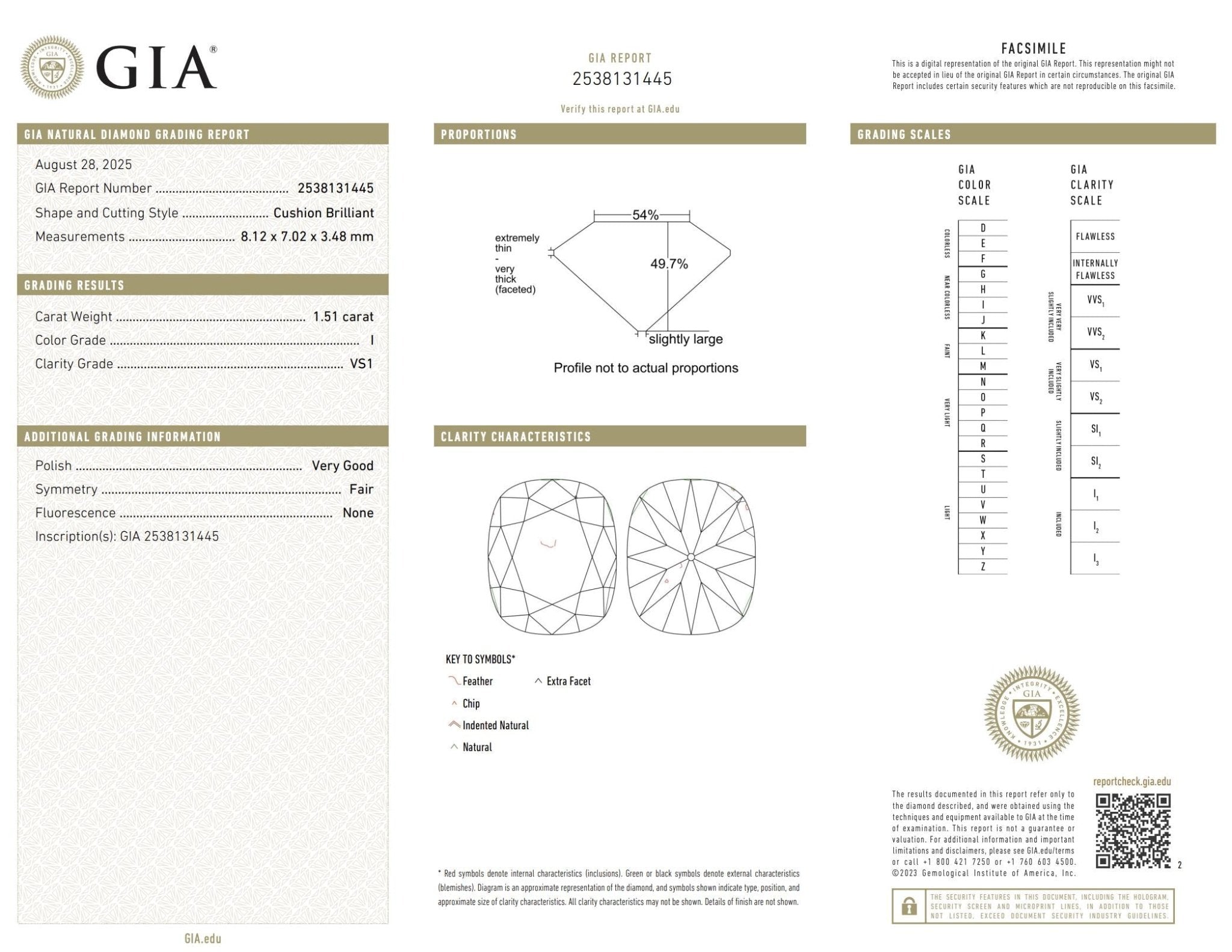 This exquisite platinum engagement ring draws its inspiration from the timeless sophistication of the Art Deco era, blending bold geometry with refined elegance. At its center glows a magnificent 1.51-carat Cushion cut diamond, certified by GIA and displaying a graceful I color and exceptional VS1 clarity. Its broad facets and soft, pillowed shape create a luminous presence, evoking the romance and architectural beauty that defined Deco-era craftsmanship.