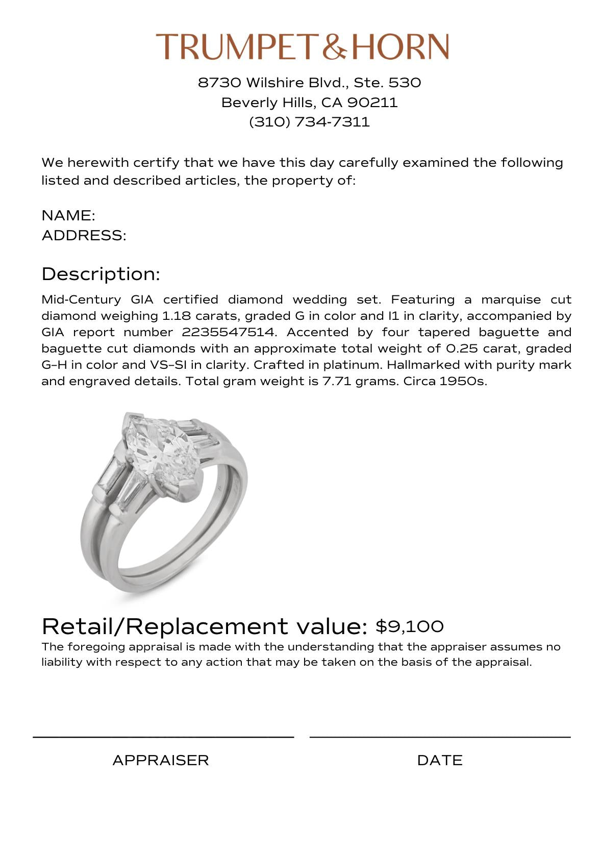 Mid Century GIA 1.18 carat diamond platinum wedding set