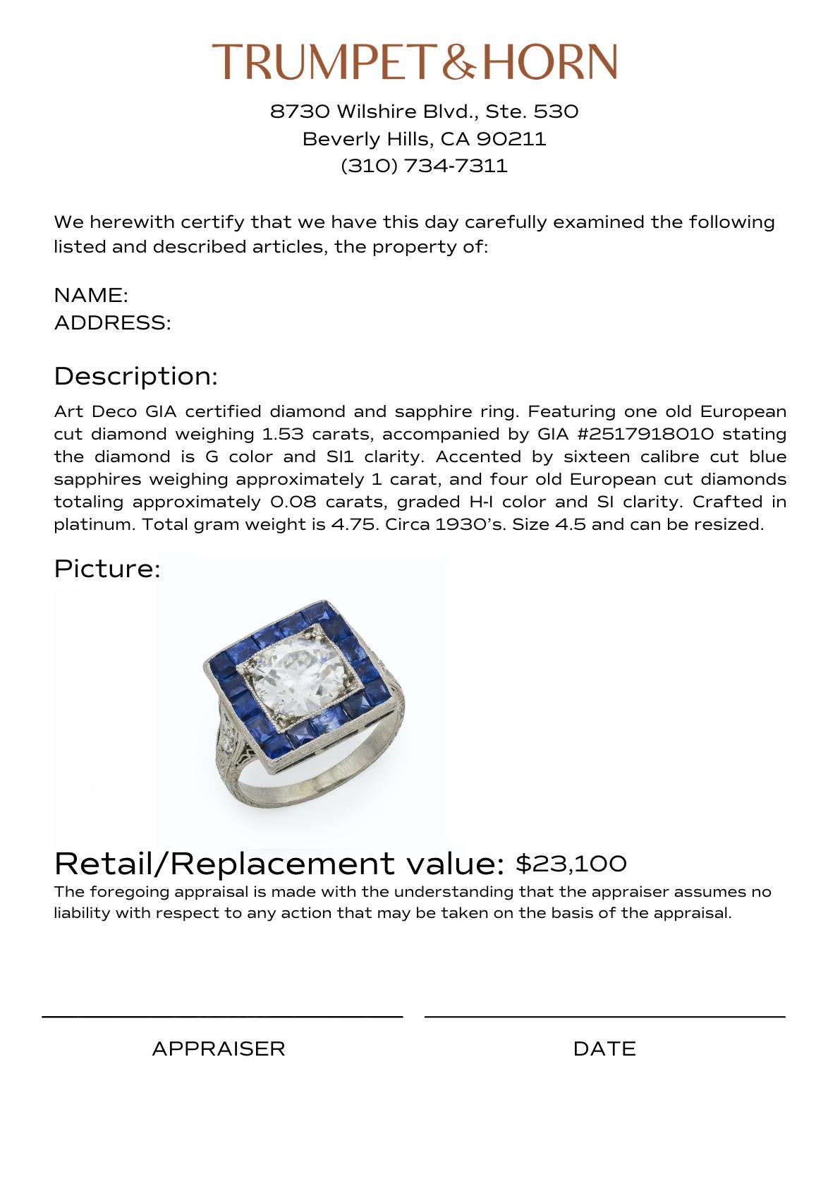 Art Deco platinum diamond and sapphire ring featuring a 1.53 carat GIA-certified old European cut diamond, circa 1930’s.