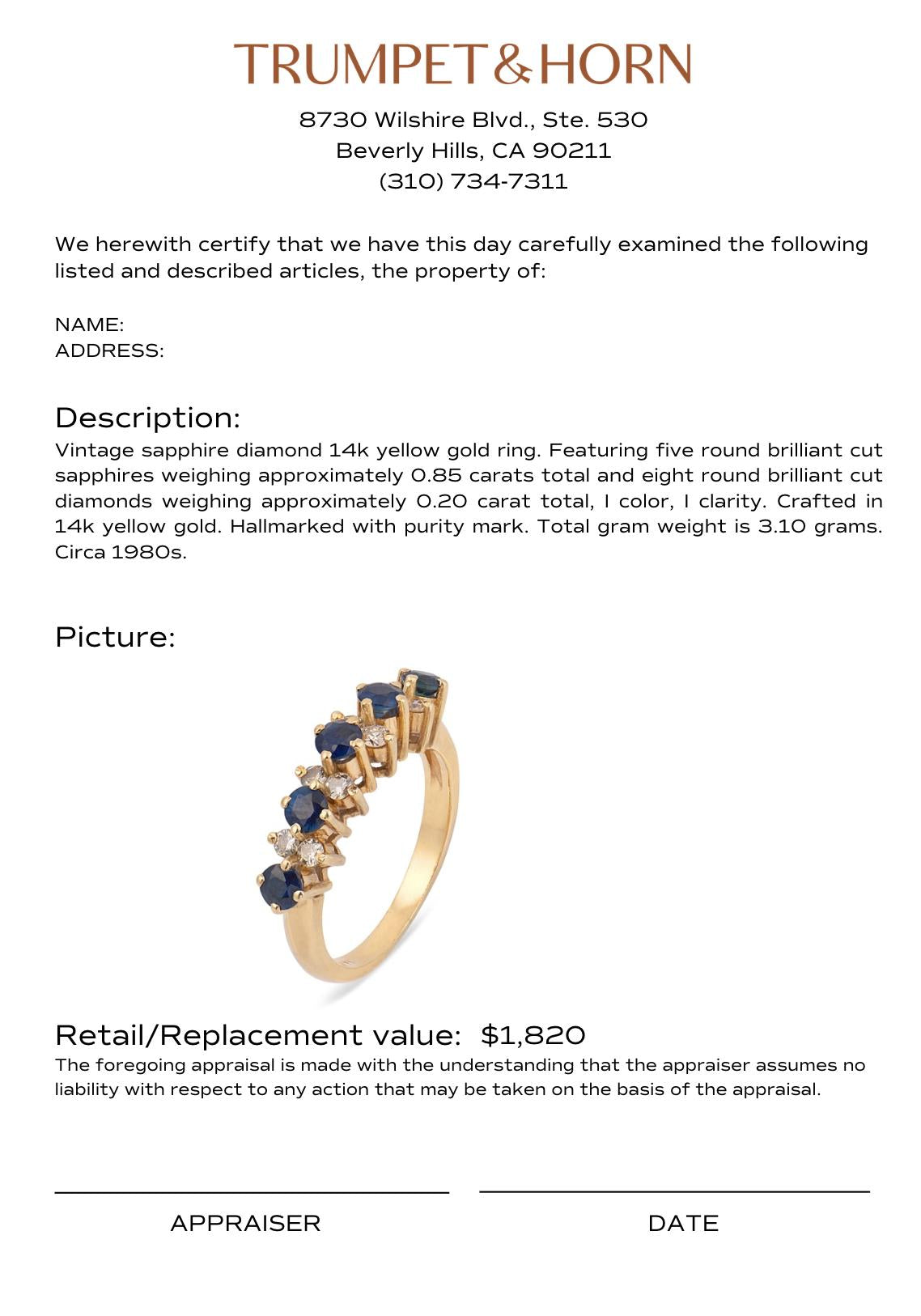 Eight round brilliant cut diamonds add delicate sparkle along the design, totaling approximately 0.20 carats. Their shimmering brilliance enhances the vivid sapphires while maintaining a subtle, sophisticated look. Crafted in 14k yellow gold and dating to the 1980s, this ring offers classic style, vibrant color, and enduring charm in a beautifully wearable vintage piece.