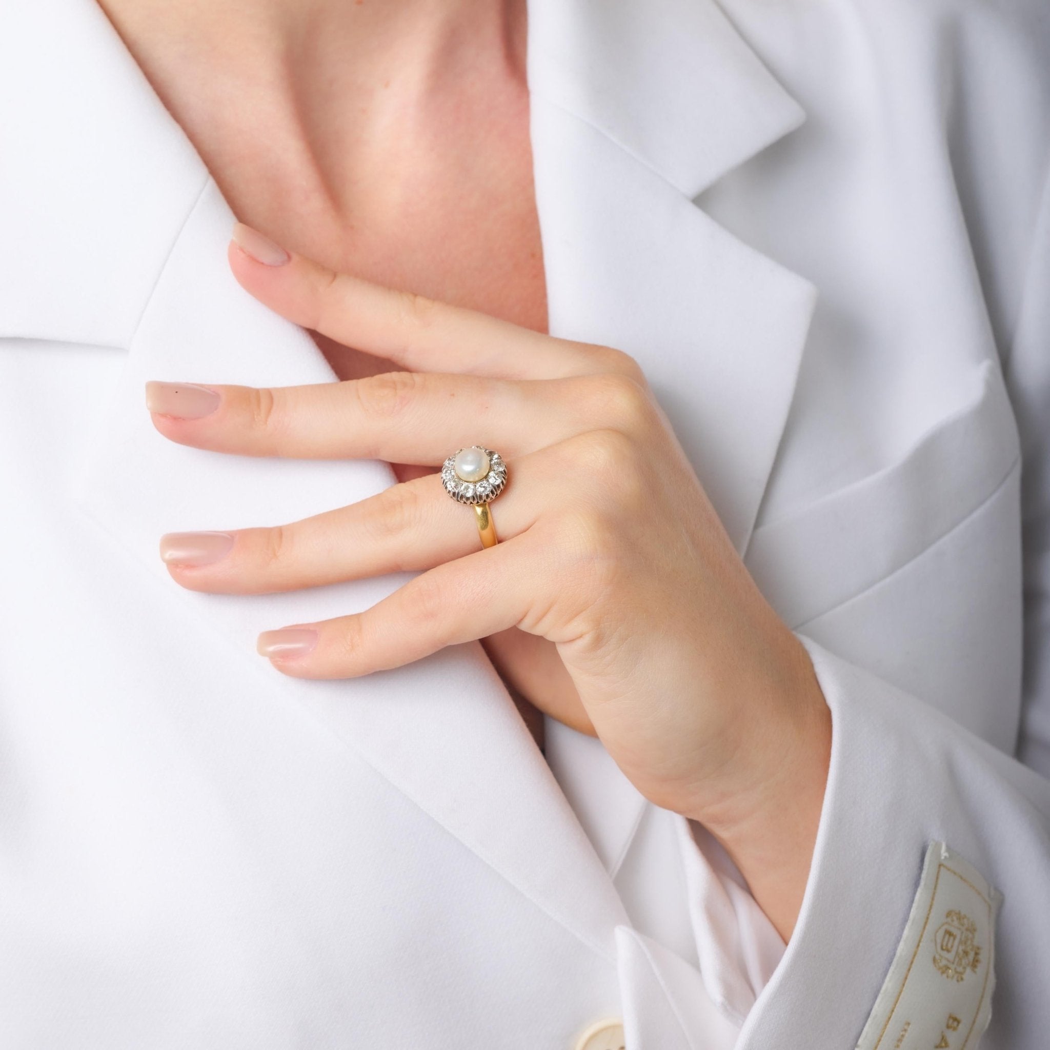 Dating to the early 1900s, this ring captures the romance and refinement of its era—graceful, feminine, and rich in character. A true heirloom piece, it is ideal for collectors and lovers of antique jewelry who appreciate natural pearls, historic diamond cuts, and timeless design.