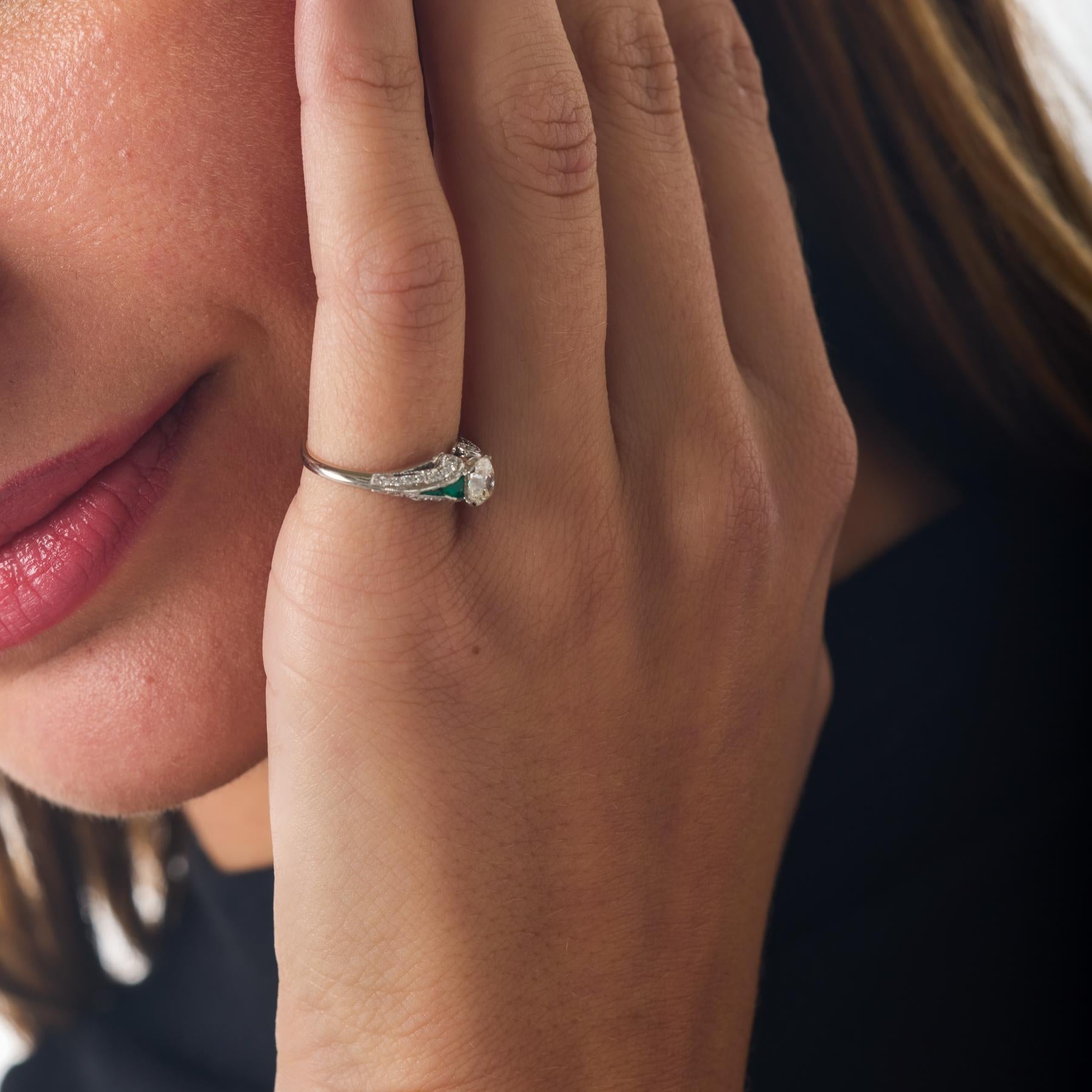 Art Deco 0.45 carat old mine cut diamond emerald platinum engagement ring