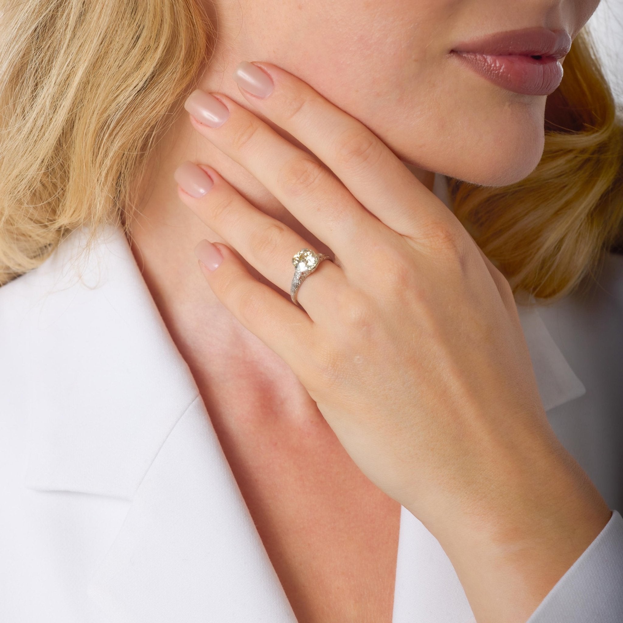 Accentuating the center stone are four single cut diamonds totaling approximately 0.08 carat. These delicate accent diamonds add subtle sparkle and balance, framing the center stone without distraction and reinforcing the ring’s elegant symmetry. Their gentle brilliance complements the Old European cut perfectly, preserving the ring’s authentic period aesthetic.