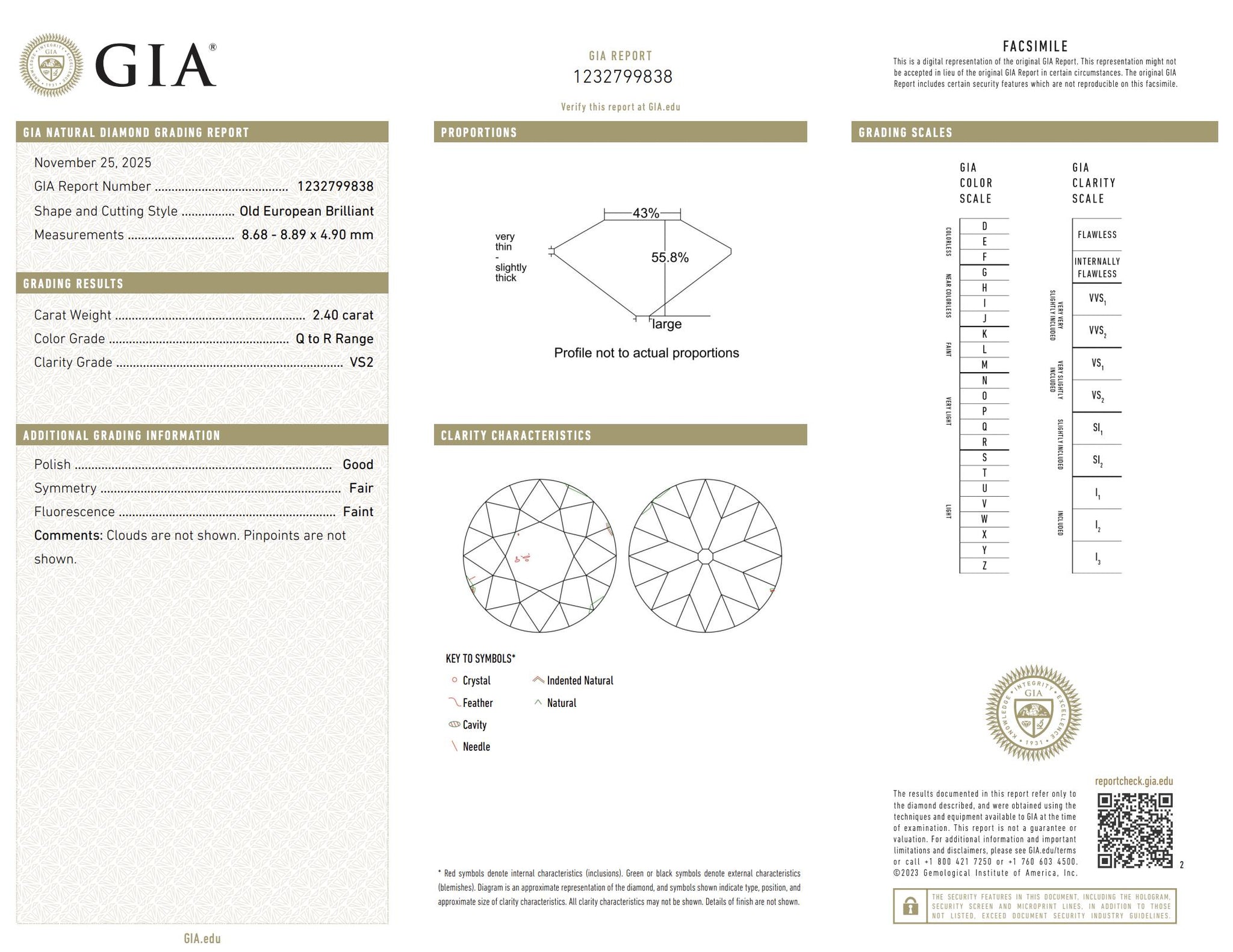 This striking Art Deco engagement ring is a timeless embodiment of 1930s sophistication, defined by clean lines, refined proportions, and the unmistakable romance of antique diamond cutting. At its center rests a magnificent GIA-certified 2.40-carat Old European cut diamond, celebrated for its broad facets and softly rounded shape that capture light in a warm, glowing manner. The diamond’s Q–R color lends a rich, candlelit warmth that enhances its antique character, while the exceptional VS2 clarity ensures remarkable transparency and presence.