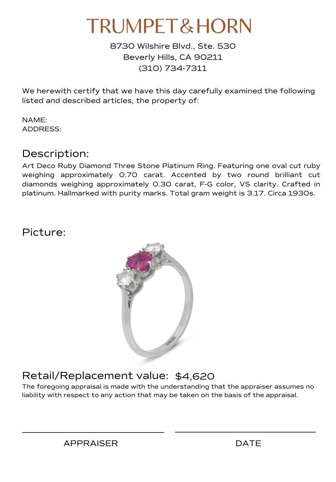 This elegant Art Deco three stone ring showcases a richly colored oval ruby at its center, glowing with deep, captivating warmth. Flanked by brilliant round diamonds, the composition creates a striking balance of color and light, enhancing the ruby’s natural vibrancy. Set in sleek platinum, the design reflects the clean lines and refined symmetry of the 1930s, offering a look that is both bold and timeless. Sophisticated and full of character, this ring is a beautiful representation of classic Art Deco craftsmanship with enduring appeal.