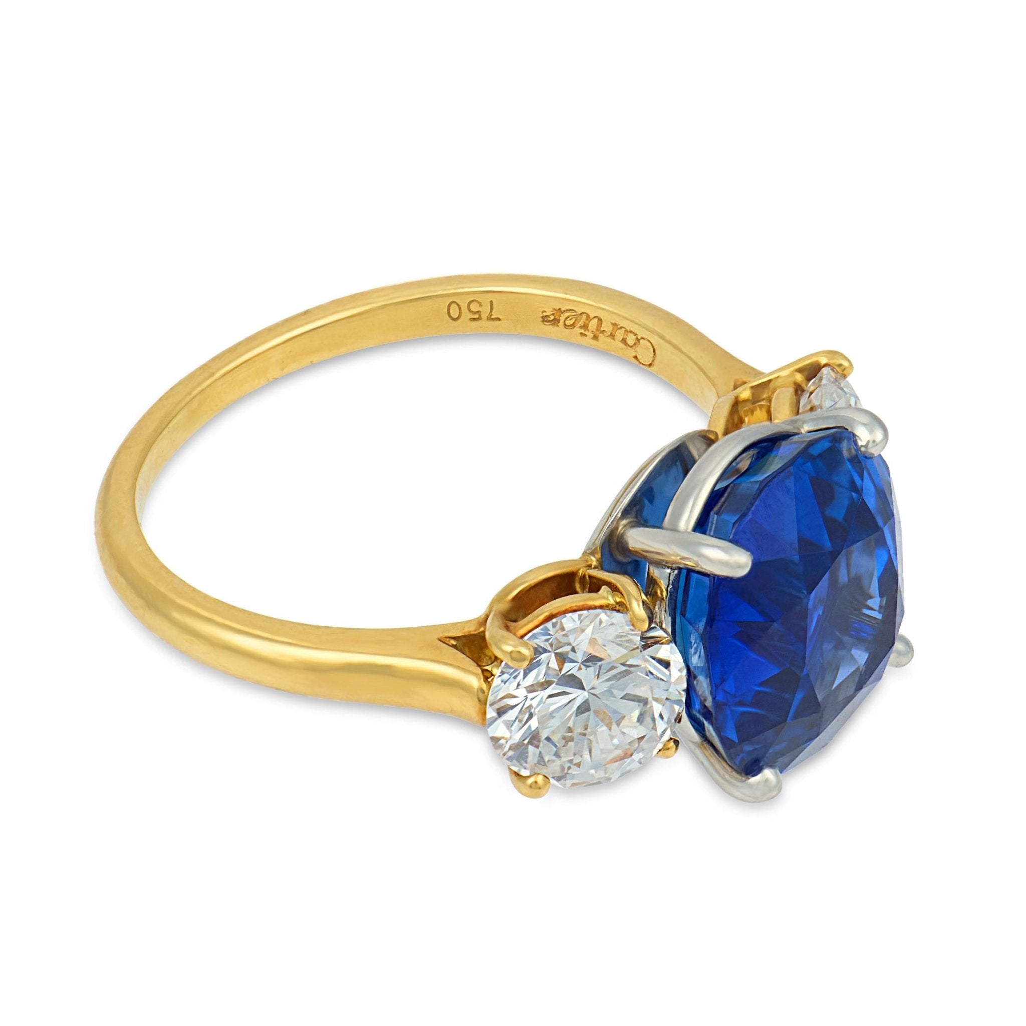 An extraordinary vintage Cartier ring featuring a 5.62 carat unheated Ceylon sapphire flanked by brilliant diamonds in gold and platinum.