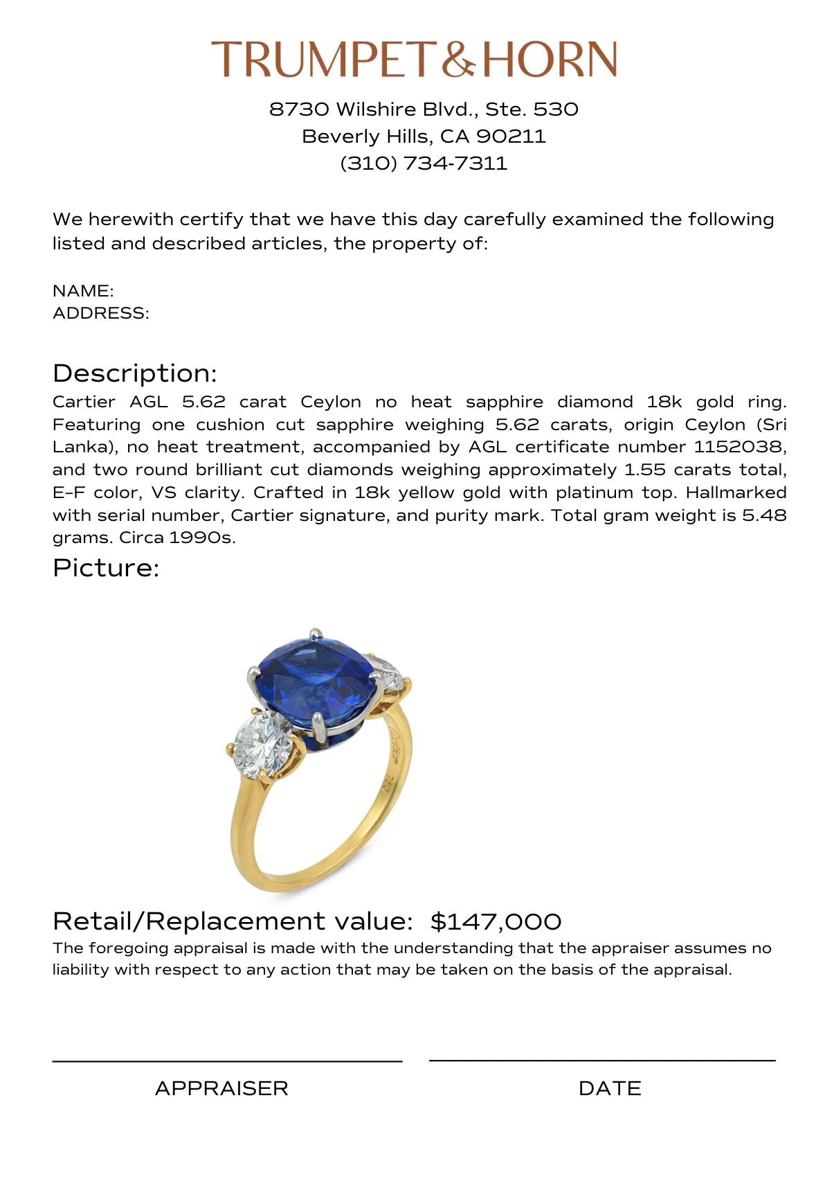 Cartier AGL 5.62 carat Ceylon No Heat sapphire diamond 18k gold ring