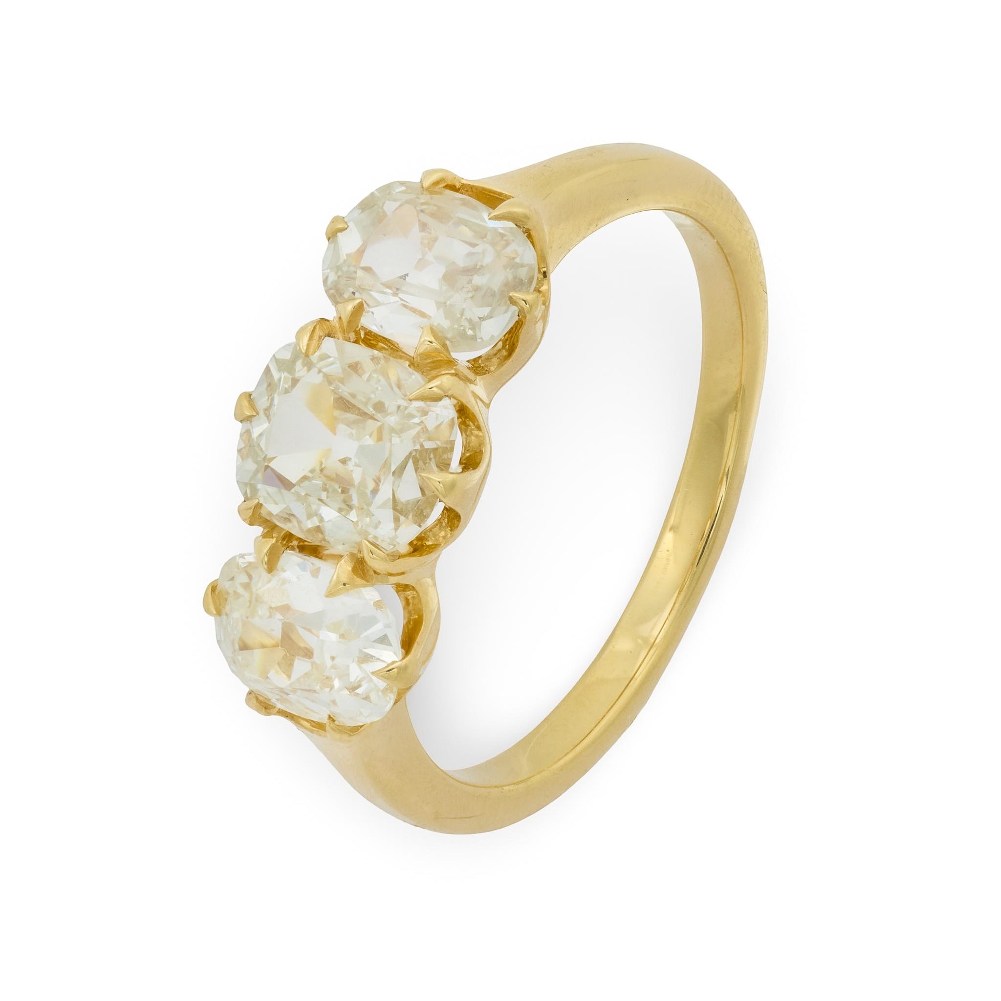 Contemporary 1.69 carat old mine cut diamond 18k yellow gold 3 stone ring