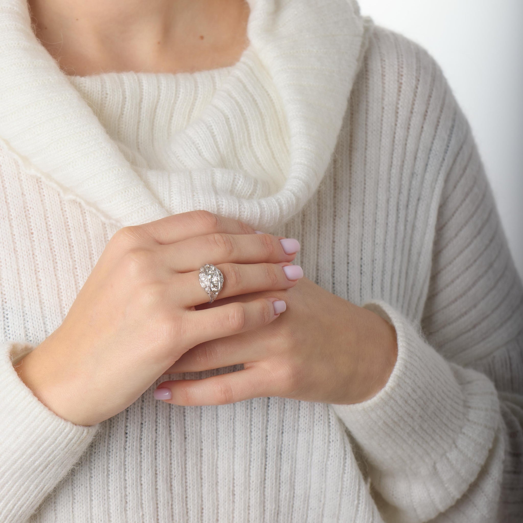 Crafted entirely in platinum, the setting reflects the era’s innovative use of the metal, allowing for fine, airy construction while remaining strong and enduring. The cool tone of the platinum enhances the diamonds’ luminosity and preserves the ring’s crisp, sophisticated appearance. With a comfortable yet substantial gram weight of 4.20, the ring feels luxurious without excess.