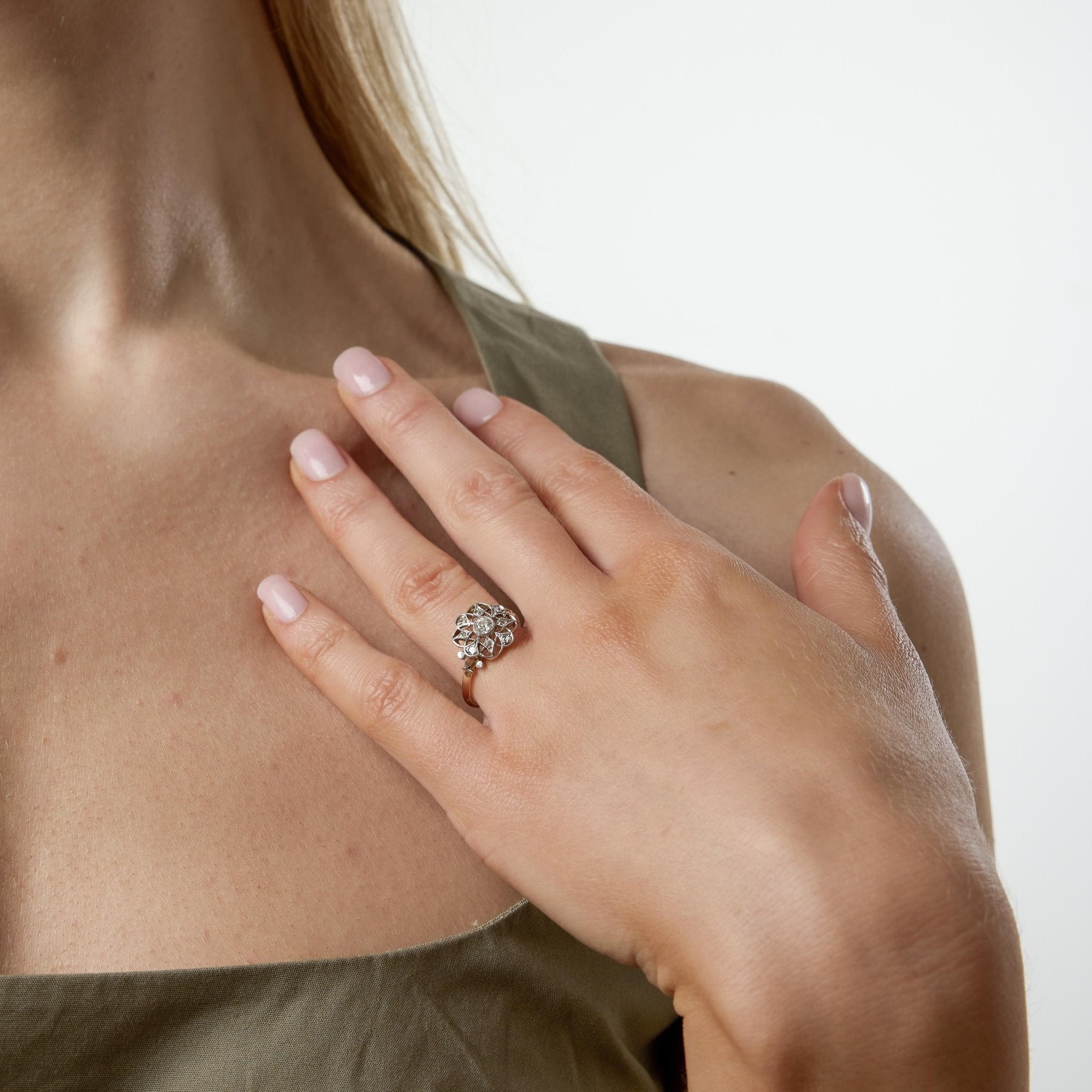 A refined French Belle Époque flower ring set with an old European diamond and rose cut accents in yellow gold and platinum.