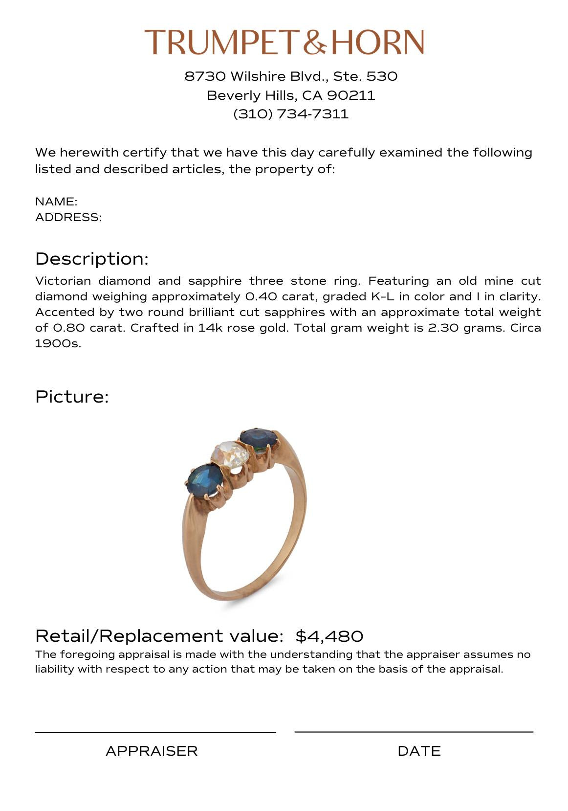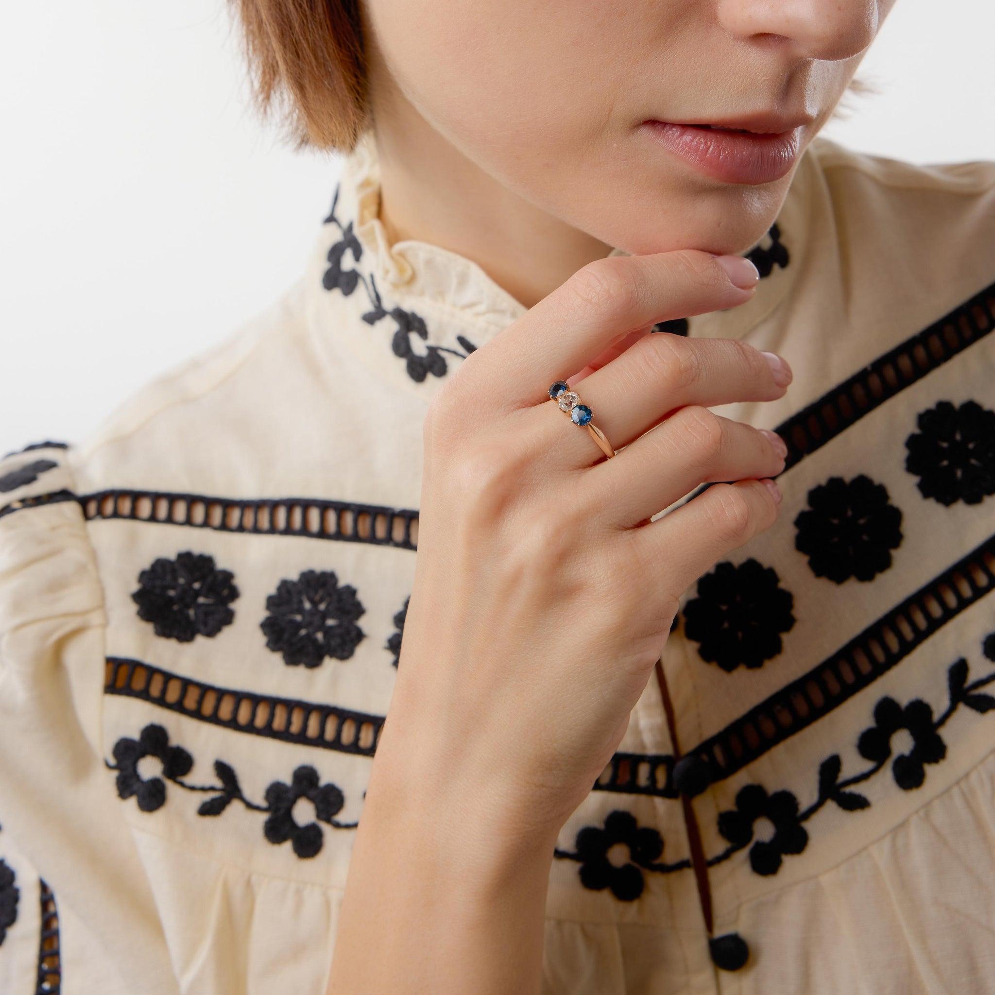 This Victorian diamond and sapphire three stone ring is a graceful expression of antique charm and timeless symbolism. At its center rests an old mine cut diamond, prized for its soft, hand-cut facets and warm, candlelit brilliance that reflect the artistry of the late nineteenth century. The diamond’s character and gentle glow anchor the design with authenticity and depth.