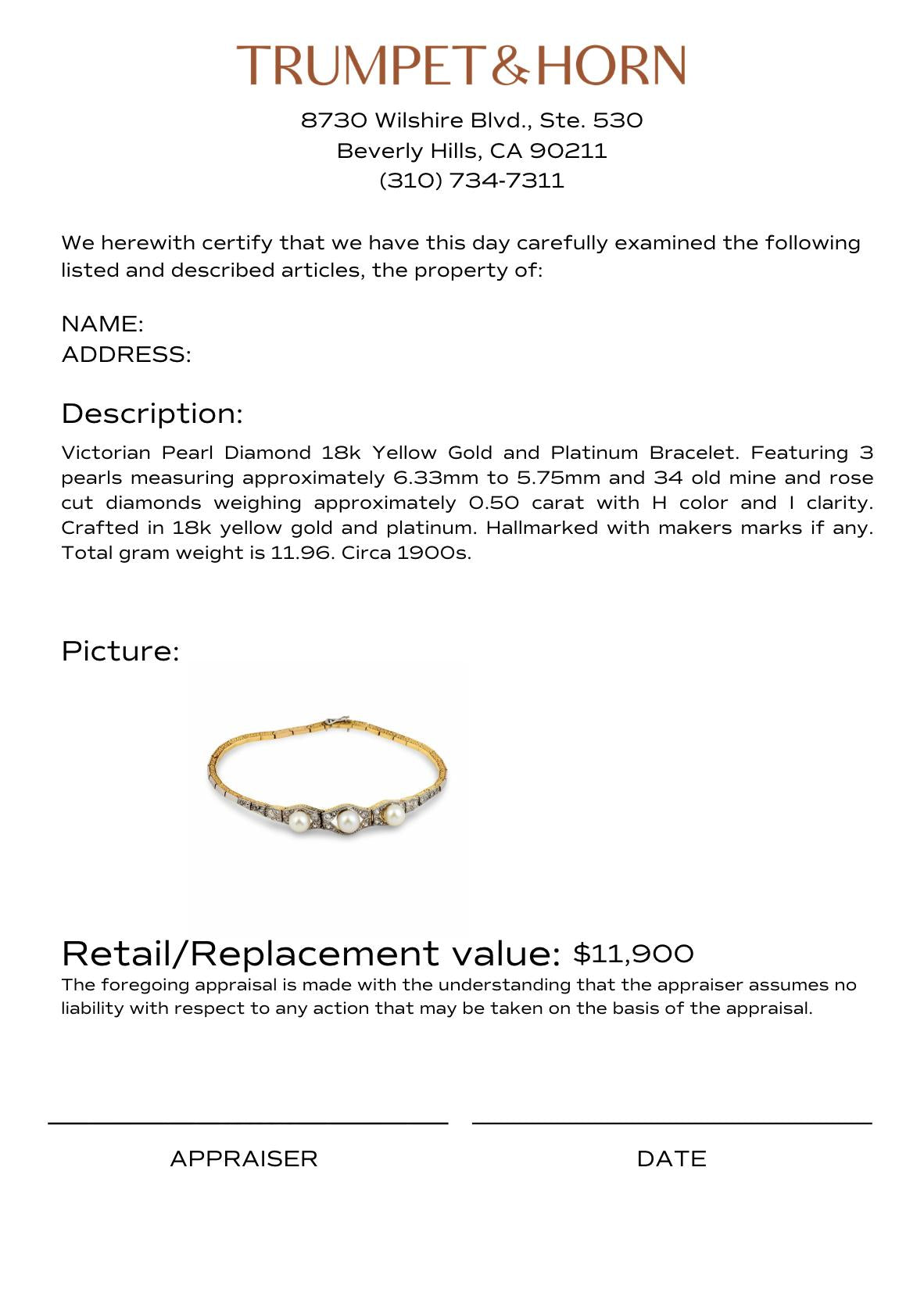 A romantic Victorian pearl and diamond bracelet crafted in 18k yellow gold and platinum.