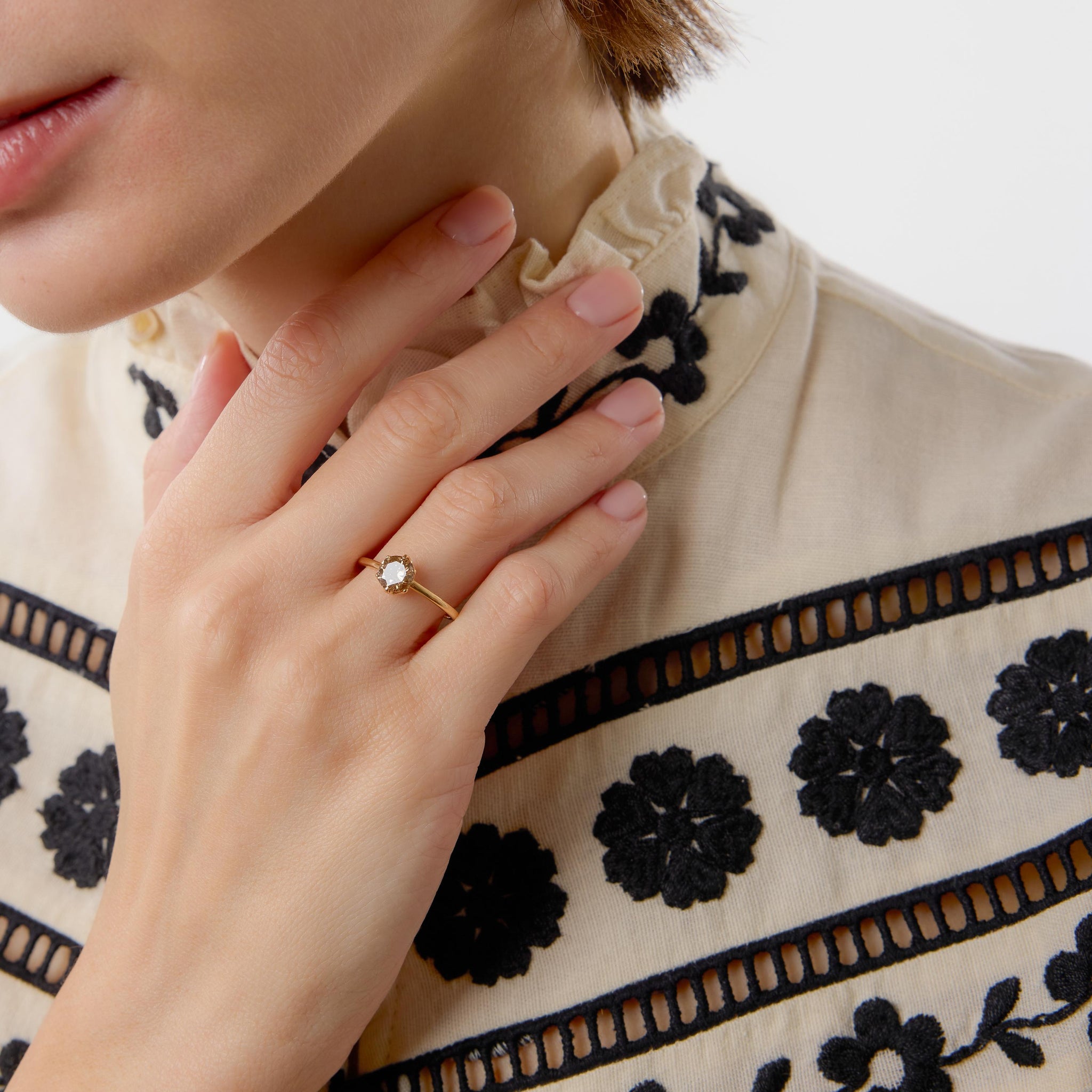 Elegant and individual, this ring is a beautiful choice for those who appreciate distinctive diamonds and antique-inspired style. It is a piece defined by warmth and personality—an engagement ring designed to feel romantic, expressive, and enduringly unique.