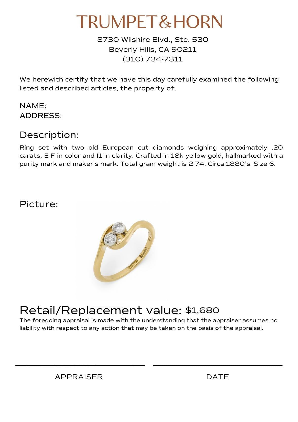 Victorian .20 carat old European cut diamond 18k yellow gold two stone ring