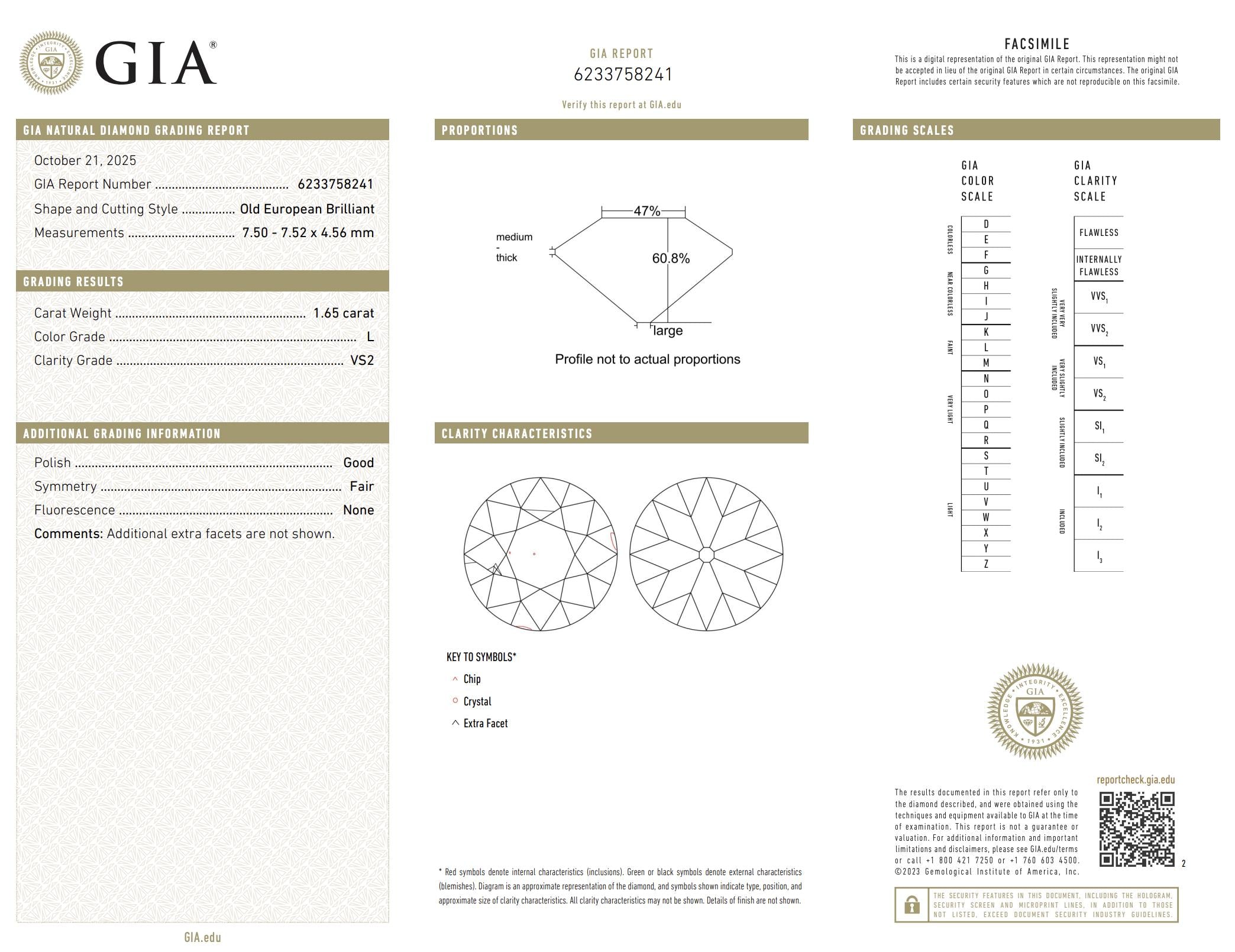 This exquisite Art Deco engagement ring centers a luminous 1.65-carat Old European Brilliant diamond, its historic cut radiating a warm, romantic glow. Two marquise diamonds frame the center stone with refined symmetry, enhancing its presence while maintaining the clean architectural lines of early 20th-century design. The platinum setting lends a cool, elegant contrast, highlighting the diamond’s soft fire and vintage character. Distinctive, balanced, and beautifully crafted, this ring embodies the sophistication and timeless artistry of the 1920s.