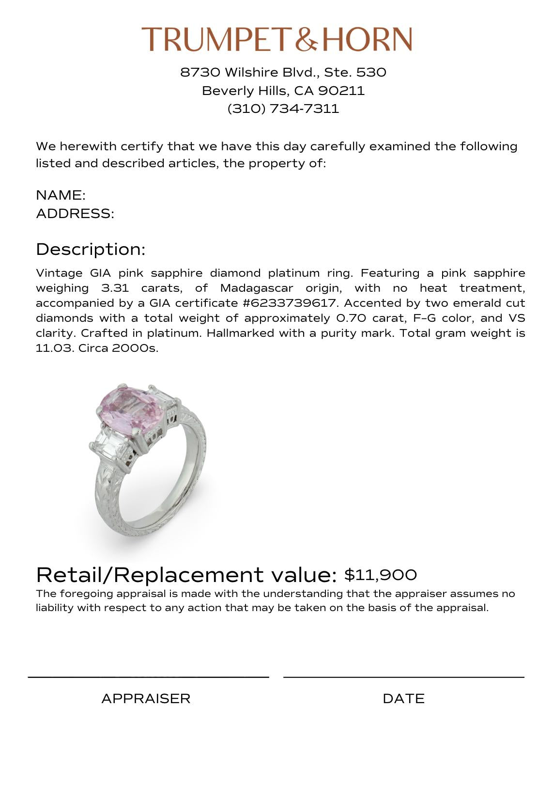 GIA 3.31 carat no heat pink sapphire diamond platinum ring