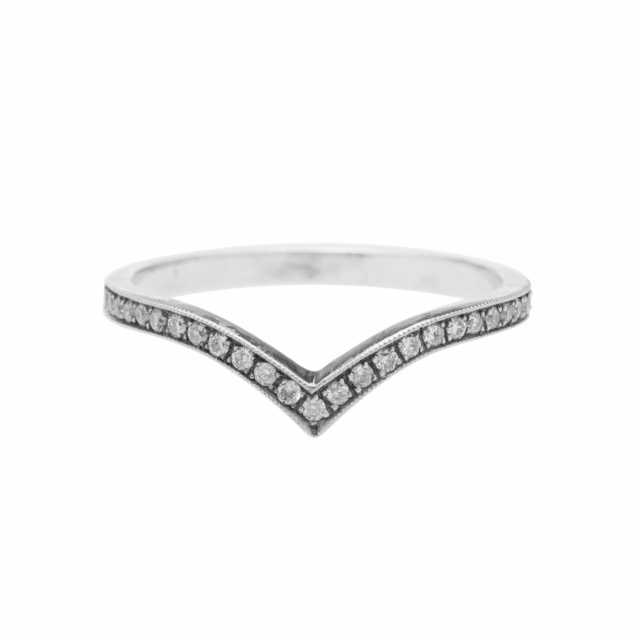 Descanso is an incredibly chic vintage-inspired addition to our Trumpet & Horn exclusive collection of wedding bands. Shown in platinum this band features 25 Round Brilliant Cut diamonds, totaling exactly 0.13ct. The sparkling diamonds in this exceptional chevron style band are prong set and travel 75% of the way around. Each stone is accented by delicate milgraining work along the outer edges. The ring's shape is designed to be a perfect compliment to our vintage and modern engagement rings but is equally as fabulous worn on its own.