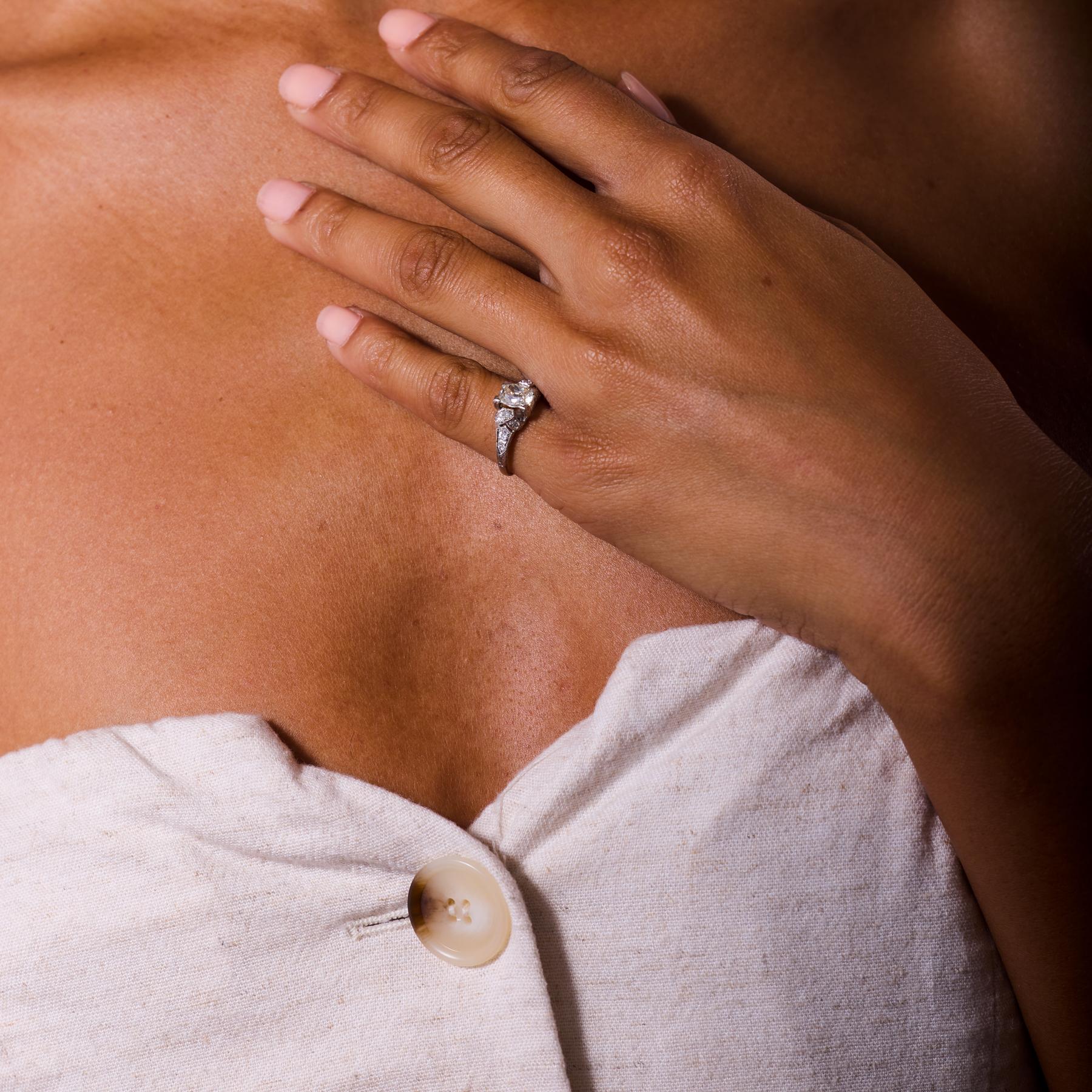 A stunning reflection of Art Deco refinement, this 1930s engagement ring showcases a 1.22 carat GIA-certified old mine cut diamond glowing with the romantic warmth of its M color and the exceptional clarity of VS2. The center stone’s cushion shape and broad facets radiate a soft, fiery brilliance, framed by ten single cut accent diamonds that shimmer with delicate light. Set in polished platinum, the ring embodies the geometric precision and elegant craftsmanship of the Art Deco era. Poised and timeless, it is a treasure of architectural beauty and vintage charm.