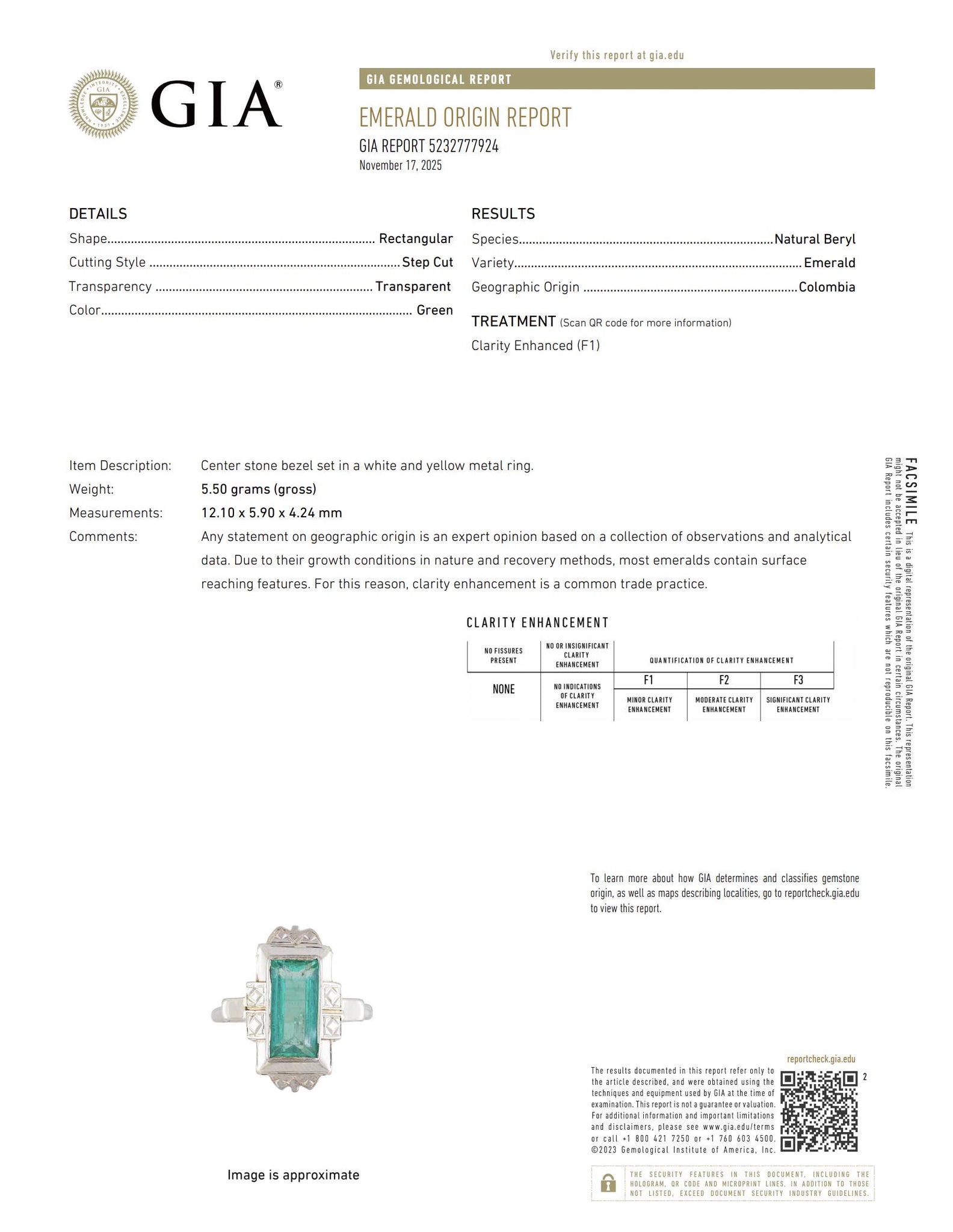 This remarkable Art Deco ring centers a captivating 2.10-carat Colombian emerald, certified by GIA and celebrated for its rich green hue and refined baguette cut—an elegant silhouette favored by the master jewelers of the 1930s. Its Colombian origin speaks to a legacy of rarity and prestige, with the stone’s gentle F1 enhancement allowing its natural beauty to remain the star. Set in polished 18k white gold, the ring displays the sleek geometry and architectural balance that define the Art Deco era, where symmetry, clean lines, and bold presence converged to create enduring works of wearable art.