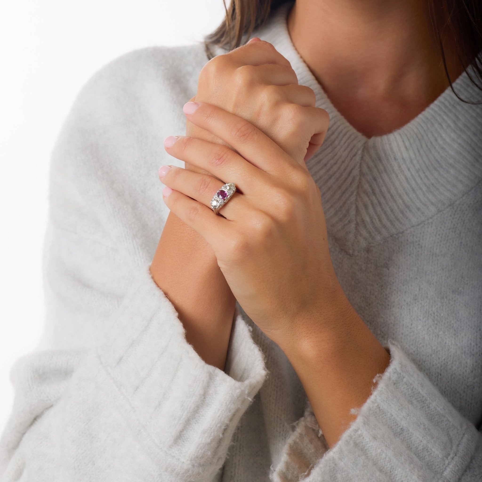 Flanking and surrounding the ruby are fourteen old European cut diamonds totaling approximately 1.80 carats. Their broad facets and antique cutting style produce a warm, flickering brilliance that contrasts beautifully with the ruby’s intensity. Graded K in color and VS in clarity, the diamonds add depth, character, and a distinctly vintage glow that feels both luxurious and authentic.