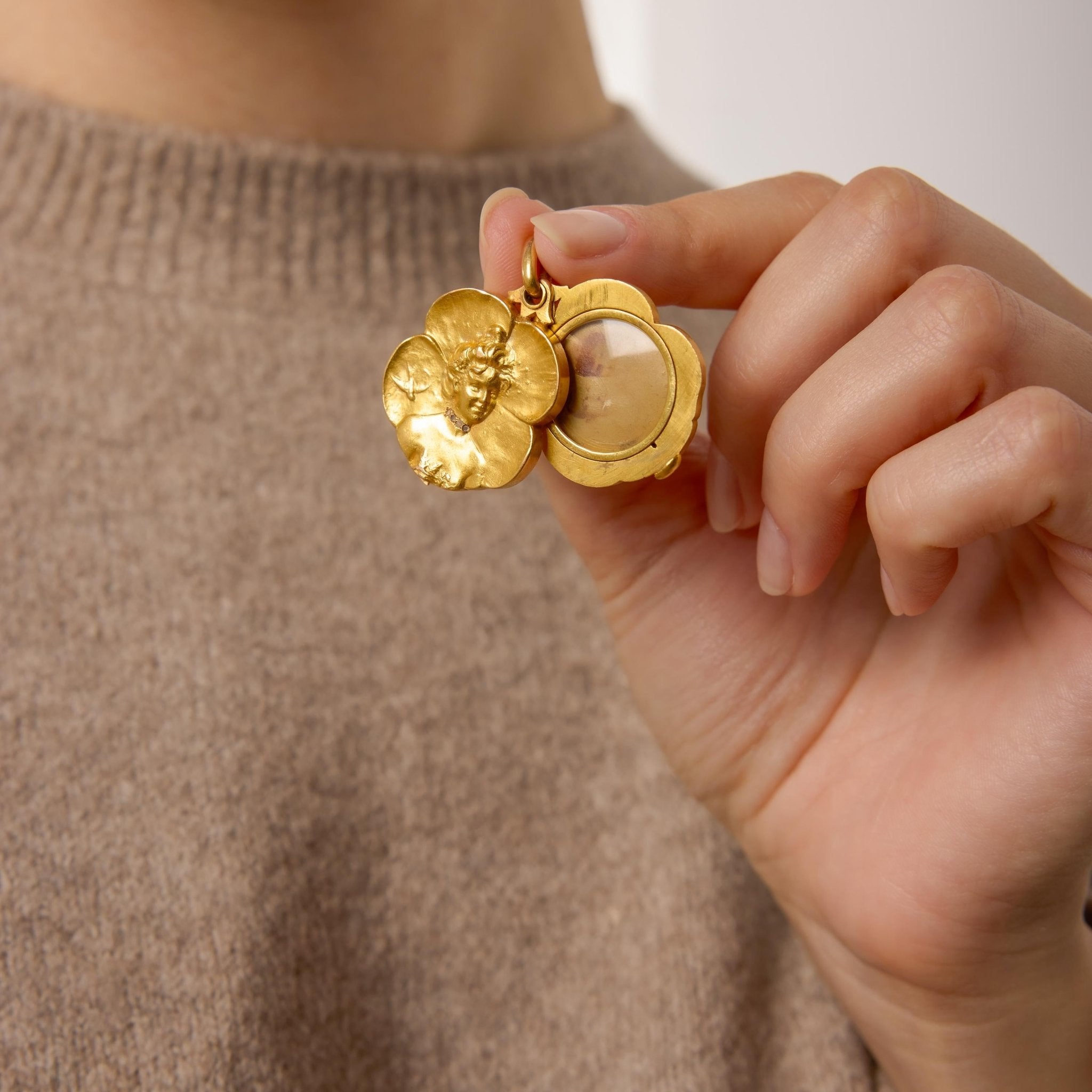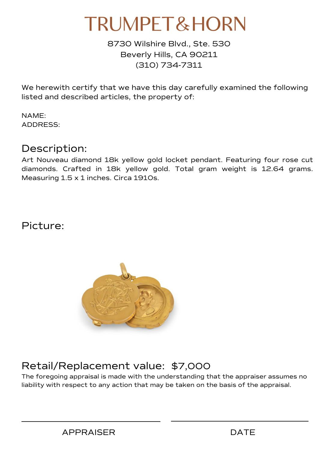 Four delicate rose cut diamonds add subtle antique sparkle, their softly faceted surfaces catching the light with gentle brilliance. The warm glow of yellow gold enhances the romantic character of the design, while the generous weight lends the piece a luxurious presence. Timeless and expressive, this Art Nouveau locket carries both historic charm and sentimental beauty, making it a treasured heirloom meant to be worn close to the heart.