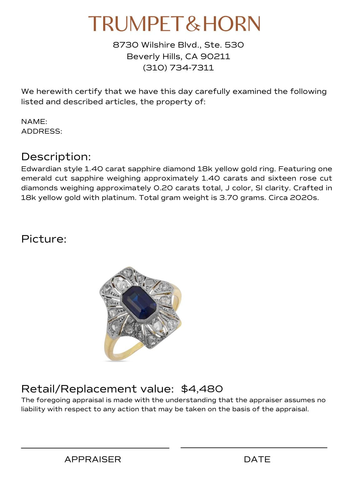 Edwardian style 1.40 carat sapphire diamond 18k yellow gold ring