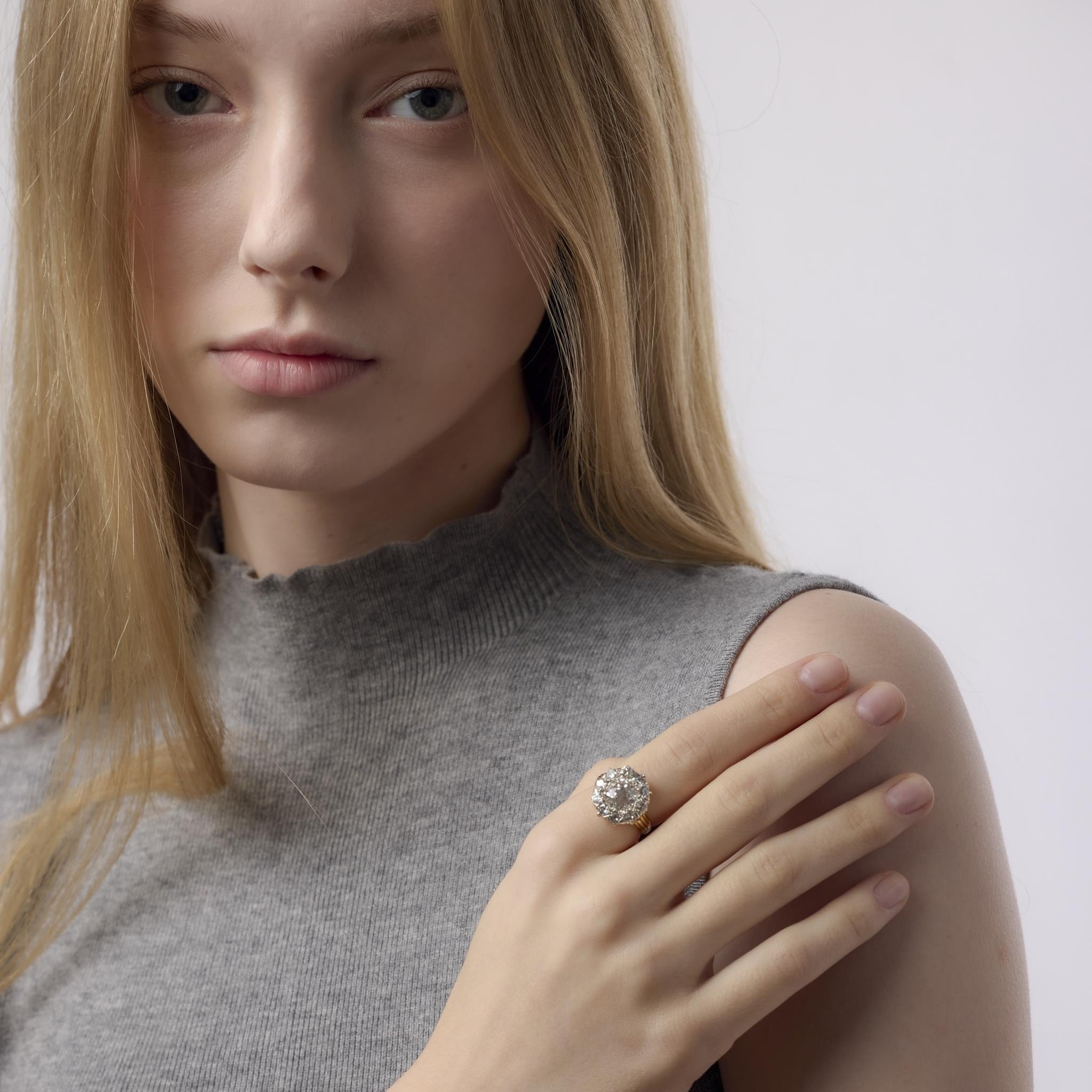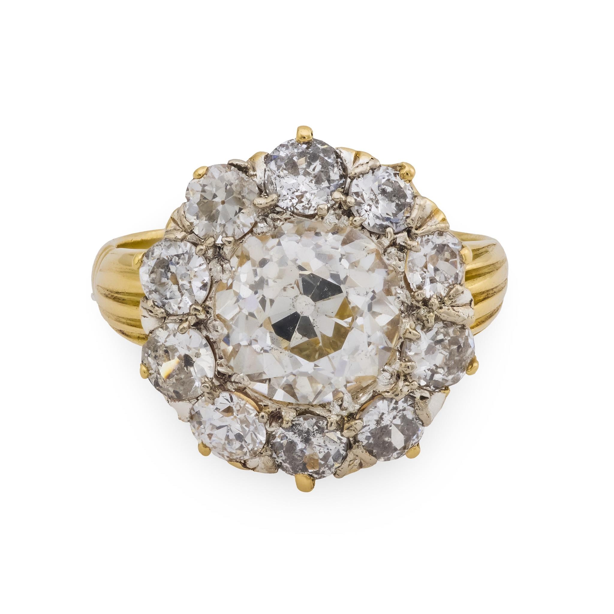 Victorian GIA 3.02 carat old European cut diamond 18k yellow gold cluster ring