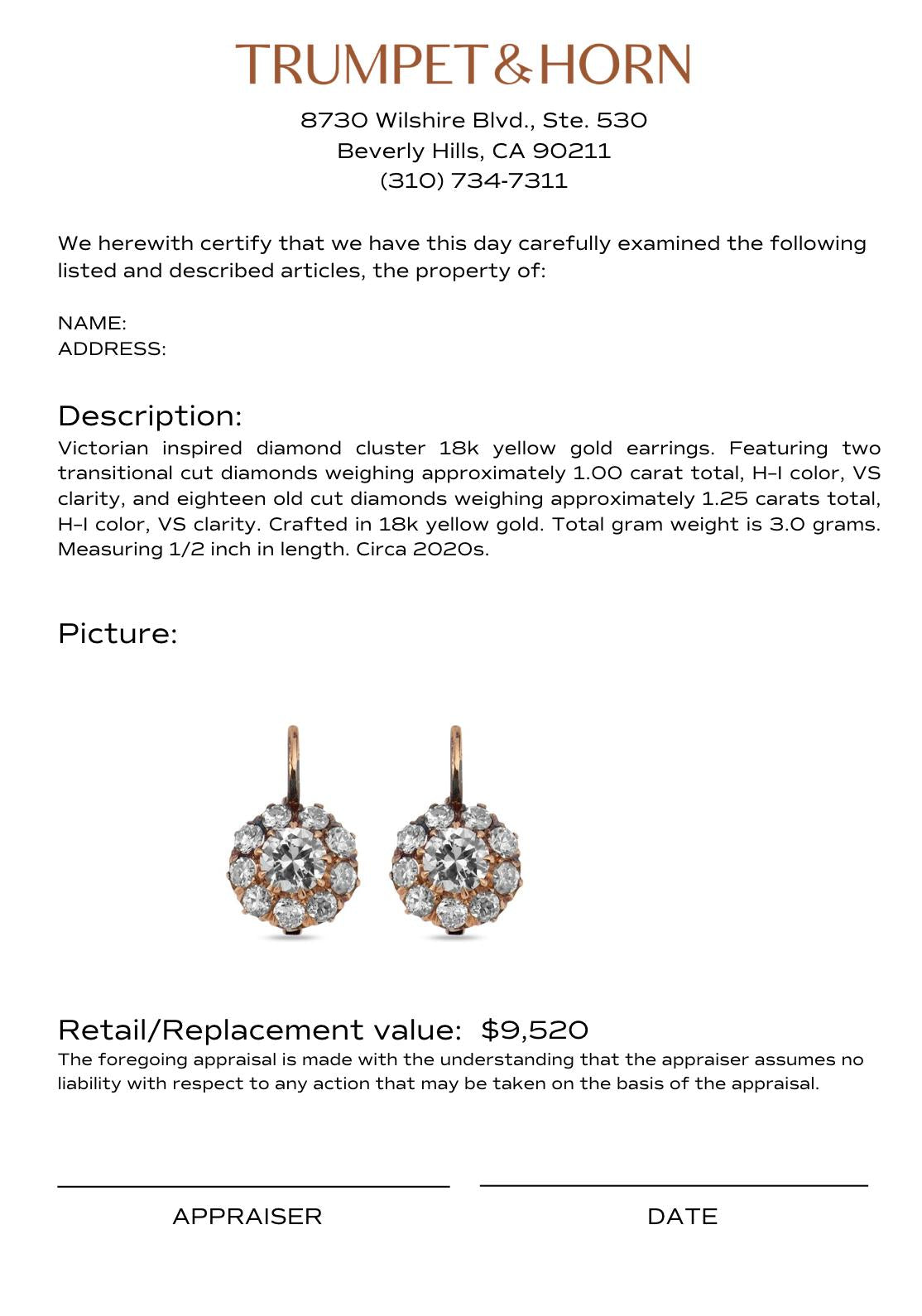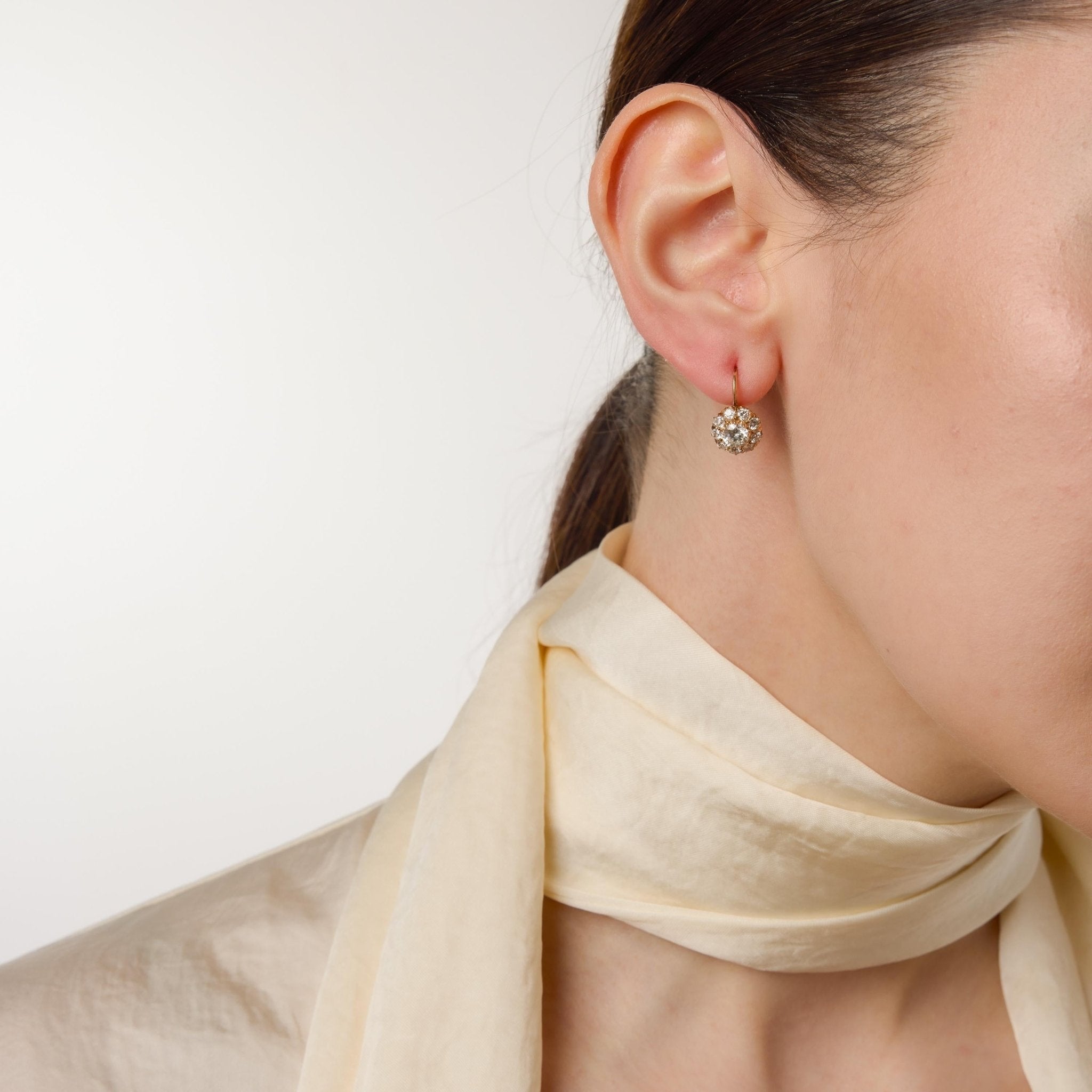 Elegant Victorian-inspired cluster earrings featuring transitional and old cut diamonds set in warm 18k yellow gold.
