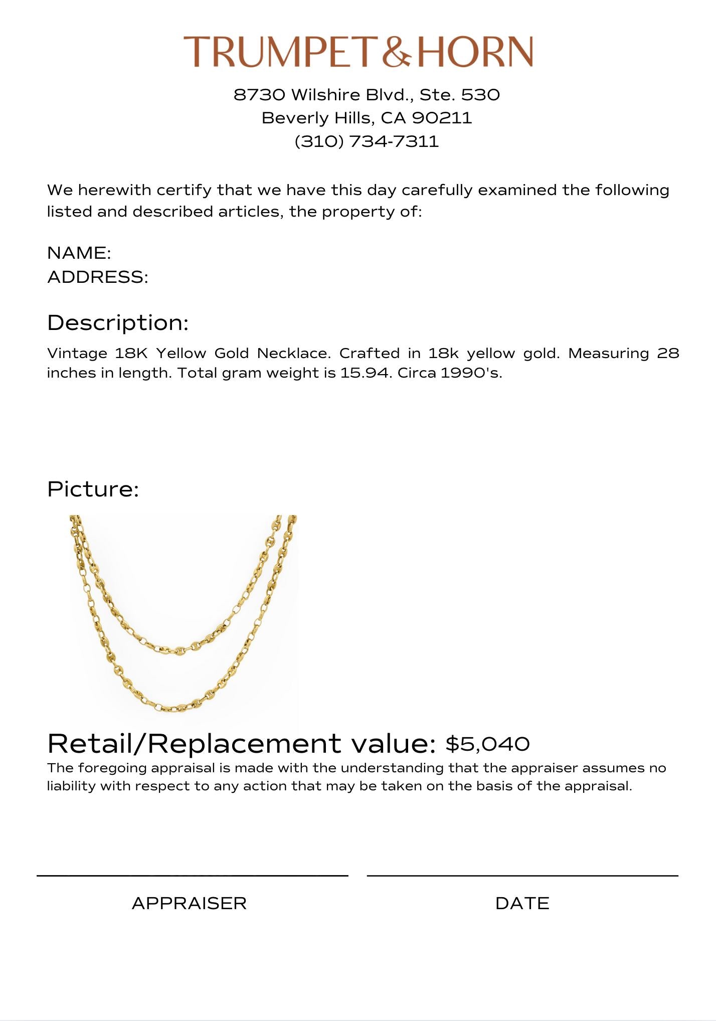 Vintage 18k yellow gold necklace measuring 28 inches and weighing 15.94 grams.